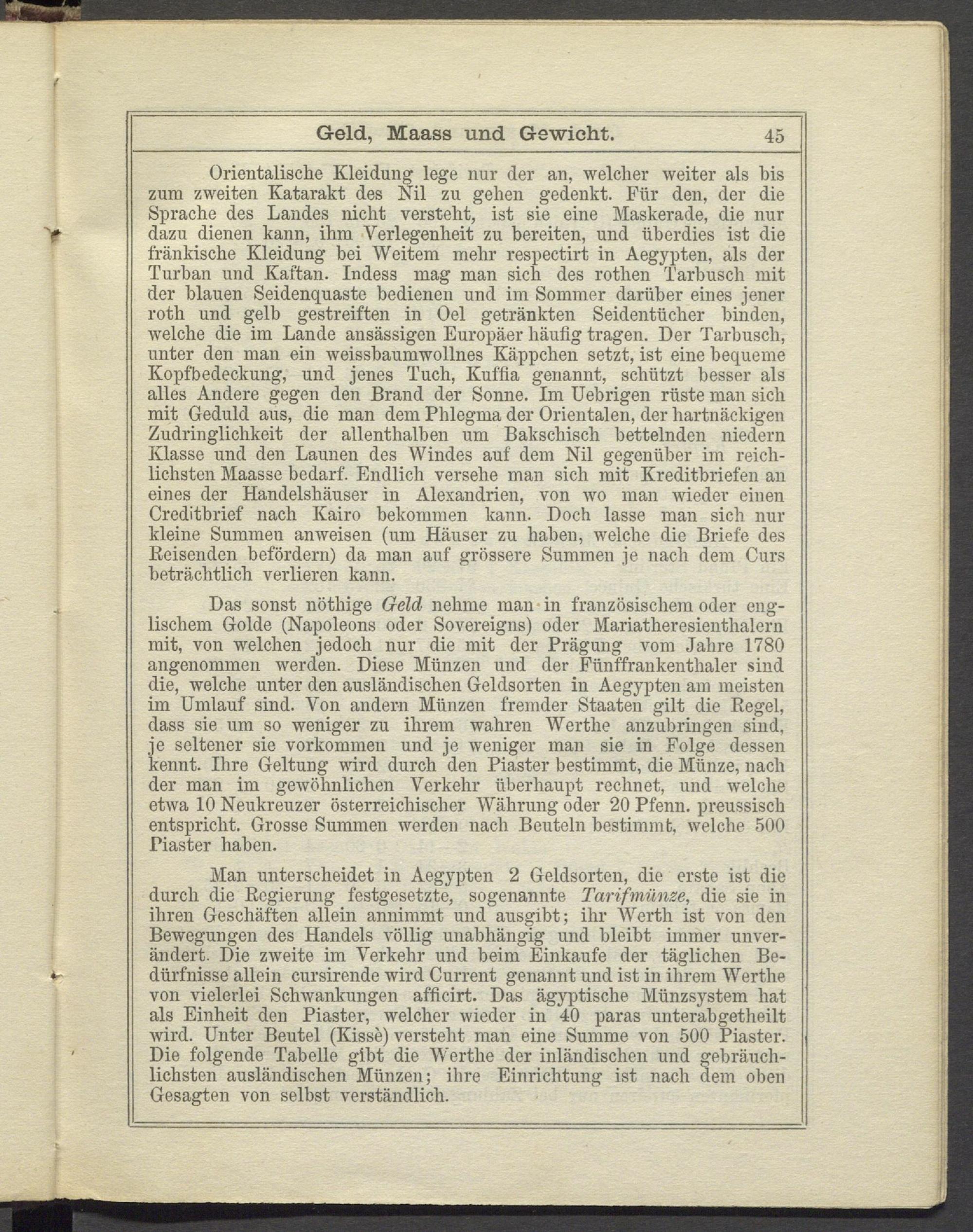 Das sonst nötliige Geld nehme man in französischem oder englischem Golde (Napoleons oder Sovereigns) oder Mariatheresienthalern mit, von welchen jedoch nur die mit der Prägung vom Jahre 1780 angenommen werden. Diese Münzen und der Fünffrankenthaler sind die, welche unter den ausländischen Geldsorten in Aegypten am meisten im Umlauf sind. Von andern Münzen fremder Staaten gilt die Regel, dass sie um so weniger zu ihrem wahren Wertlie anzubringen sind, je seltener sie Vorkommen und je weniger man sie in Folge dessen kennt. Ihre Geltung wird durch den Piaster bestimmt, die Münze, nach der man im gewöhnlichen Verkehr überhaupt rechnet, und welche etwa 10 Neukreuzer österreichischer Währung oder 20 Pfenn. preussiscb entspricht. Grosse Summen werden nach Beuteln bestimmt, welche 500 Piaster haben.