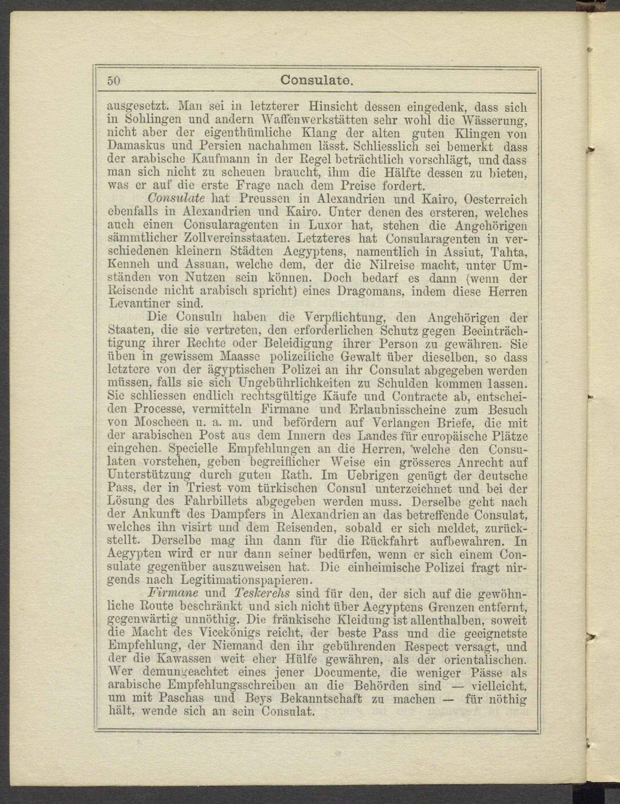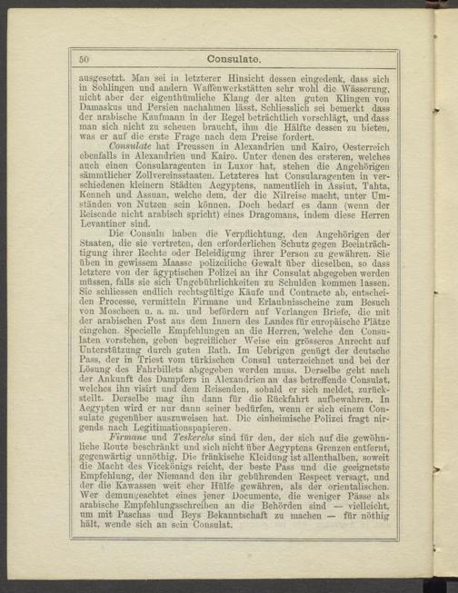 Die Consuln haben die Verpflichtung, den Angehörigen der Staaten, die sie vertreten, den erforderlichen Schutz gegen Beeinträchtigung ihrer Kechtc oder Beleidigung ihrer Person zu gewähren. Sie üben in gewissem Maassc polizeiliche Gewalt über dieselben, so dass letztere von der ägyptischen Polizei an ihr Consulat abgegeben werden müssen, falls sie sich Ungebührlichkeiten zu Schulden kommen lassen. Sie schliessen endlich rechtsgültige Käufe und Contraete ab, entscheiden Processe, vermitteln Birmane und Erlaubnisscheine zum Besuch von Moscheen u. a. m. und befördern auf Verlangen Briefe, die mit der arabischen Post aus dem Innern des Landes für europäische Plätze eingehen. Spocielle Empfehlungen an die Herren, welche den Consu- laten vorstehen, geben begreiflicher Weise ein grösseres Anrecht auf Unterstützung durch guten Bath. Im Uebrigen genügt der deutsche Pass, der in Triest vom türkischen Consul unterzeichnet und bei der Lösung des Falirbillets abgegeben werden muss. Derselbe geht nach der Ankunft des Dampfers in Alexandrien an das betreffende Consulat, welches ihn visirt und dem Reisenden, sobald er sich meldet, zurückstellt. Derselbe mag ihn dann für die Rückfahrt aufbewahren. In Aegypten wird er nur dann seiner bedürfen, wenn er sich einem Consulate gegenüber auszuweisen hat. Die einheimische Polizei fragt nirgends nach Legitimationspapieren.