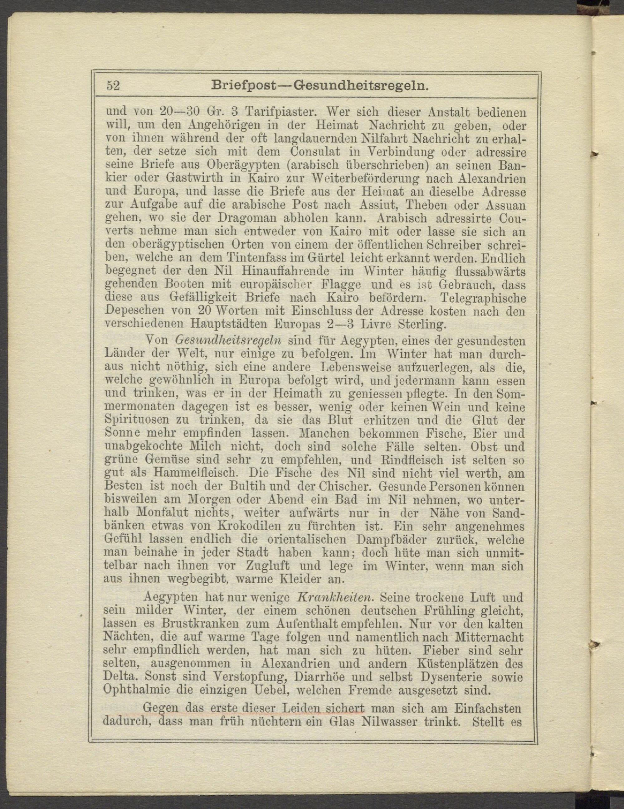 Von Gesundheitsregeln sind für Aegypten, eines der gesundesten Länder der Welt, nur einige zu befolgen. Im Winter hat man durchaus nicht nöthig, sich eine andere Lebensweise aufzuerlegen, als die, welche gewöhnlich in Europa befolgt wird, und jedermann kann essen und trinken, was er in der Heimath zu gemessen pflegte. In den Sommermonaten dagegen ist es besser, wenig oder keinen Wein und keine Spirituosen zu trinken, da sie das Blut erhitzen und die Glut der Sonne mehr empfinden lassen. Manchen bekommen Fische, Eier und imabgekochte Milch nicht, doch sind solche Fälle selten. Obst und grüne Gemüse sind sehr zu empfehlen, und Bindfleisch ist selten so gut als Hammelfleisch. Die Fische des Nil sind nicht viel werth, am Besten ist noch der Bnltih und der Chischer. Gesunde Personen können bisweilen am Morgen oder Abend ein Bad im Nil nehmen, wo unterhalb Monfalut nichts, weiter aufwärts nur in der Nähe von Sandbänken et-was von Krokodilen zu fürchten ist. Ein sehr angenehmes Gefühl lassen endlich die orientalischen Dampfbäder zurück, welche man beinahe in jeder Stadt haben kann; doch hüte man sich unmittelbar nach ihnen vor Zugluft und lege im Winter, wenn man sich aus ihnen wegbegibt, warme Kleider an.