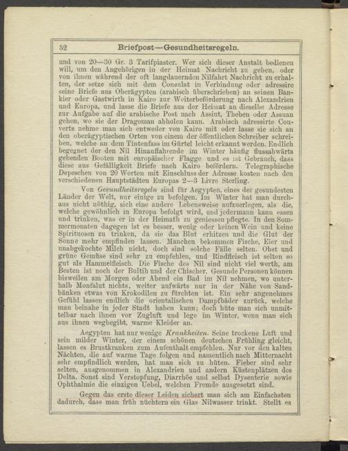und von 20—30 Gr. 3 Tarifpiaster. Wer sich dieser Anstalt bedienen will, um den Angehörigen in der Heimat Nachricht zu geben, oder von ihnen während der oft langdauerndeil Nilfahrt Nachricht zu erhalten, der setze sich mit dem Consulat in Verbindung oder adressirc seine Briefe aus Oberägypten (arabisch überschrieben) an seinen Bankier oder Gastwirth in Kairo zur Weiterbeförderung nach Alexandrien und Europa, und lasse die Briefe aus der Heimat an dieselbe Adresse zur Aufgabe auf die arabische Post nach Assiut, Theben oder Assuan gehen, wo sie der Dragoman abholen kann. Arabisch adressirte Couverts nehme man sicli entweder von Kairo mit oder lasse sie sich an den oberägyptischen Orten von einem der öffentlichen Schreiber schreiben, welche an dem Tintenfass im Gürtel leicht erkannt werden. Endlich begegnet der den Nil Hinauffahrende im Winter häutig flussabwärts gellenden Booten mit europäischer Flagge und es ist Gebrauch, dass diese aus Gefälligkeit Briefe nach Kairo befördern. Telegraphische Depeschen von 20 Worten mit Einschluss der Adresse kosten nach den verschiedenen Hauptstädten Europas 2—3 Livre Sterling.