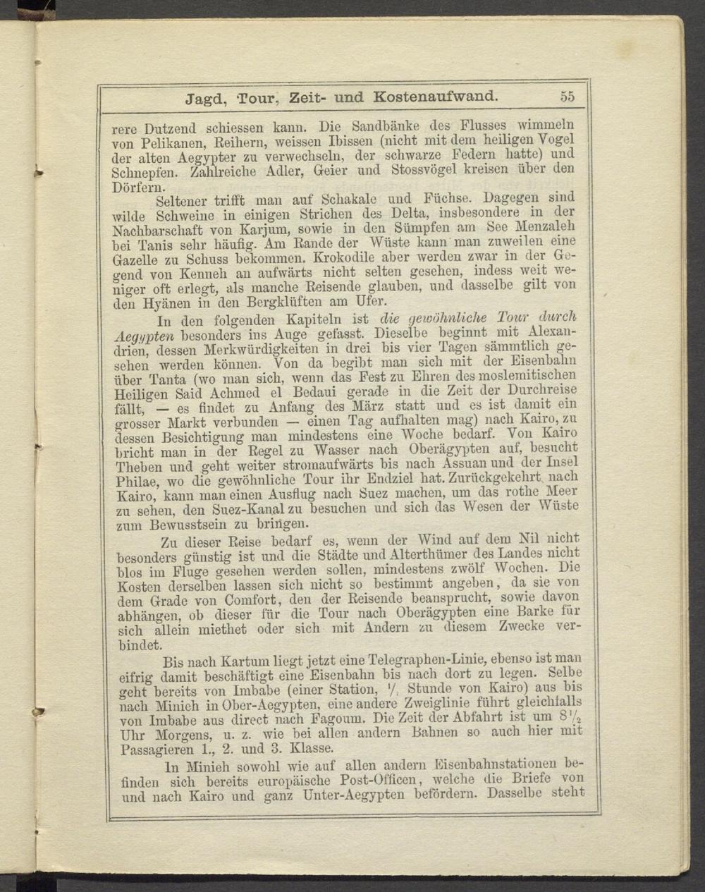 Zu dieser Reise bedarf es, wenn der Wind auf dem Nil nicht besonders günstig ist und die Städte und Alterthümer des Landes nicht blos im Fluge gesehen werden sollen, mindestens zwölf Wochen. Die Kosten derselben lassen sich nicht so bestimmt angeben, da sie von dem Grade von Comfort, den der Reisende beansprucht, sowie davon abhängen, ob dieser für die Tour nach Oberägypten eine Barke für sich allein miethet oder sich mit Andern zu diesem Zwecke verbindet.