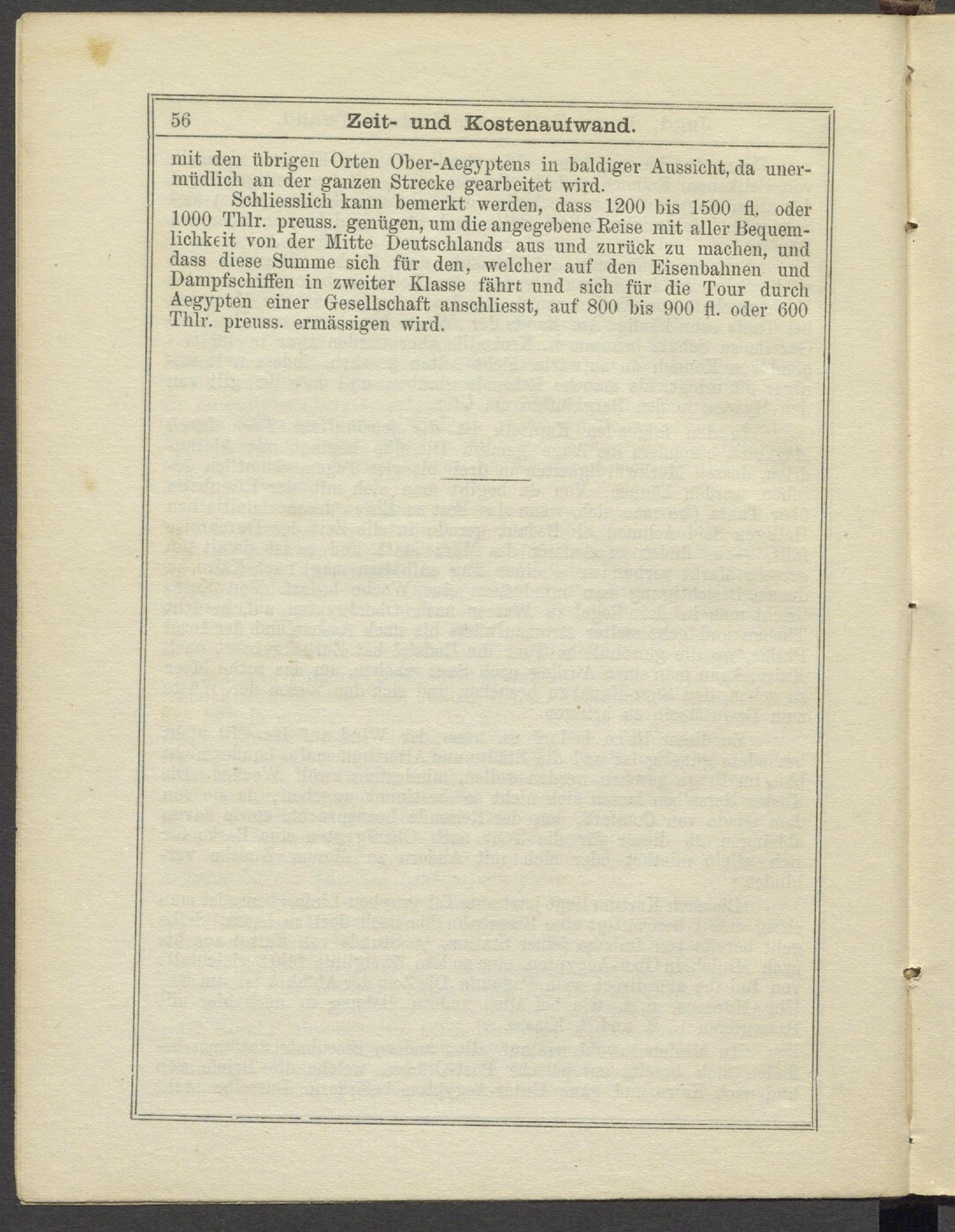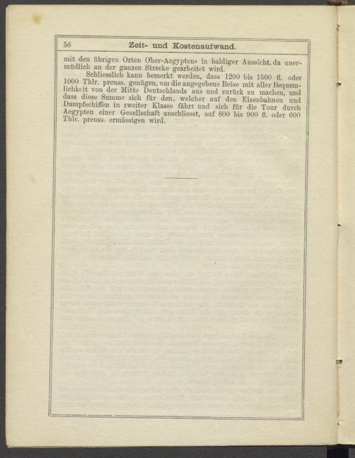 Schliesslich kann bemerkt werden, dass 1200 bis 1500 fl. oder 1000 Thlr. preuss. genügen, um die angegebene Reise mit aller Bequemlichkeit von der Mitte Deutschlands aus und zurück zu machen, und dass diese Summe sich für den, welcher auf den Eisenbahnen und Dampfschiffen in zweiter Klasse fährt und sich für die Tour durch Aegypten einer Gesellschaft anschliesst, auf 800 bis 900 fl. oder 600 Thlr. preuss. ermässigen wird.