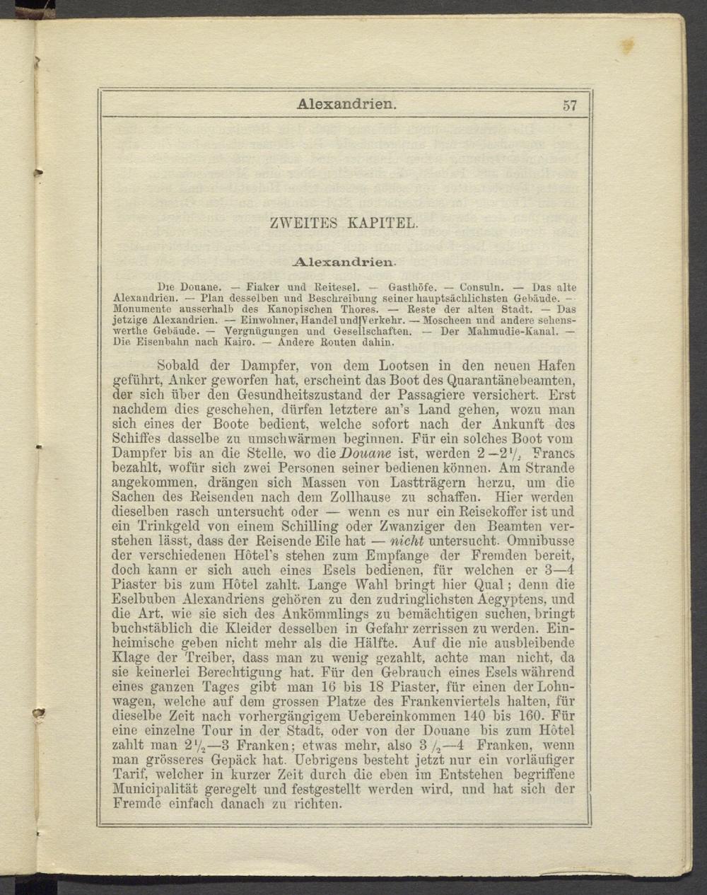 Sobald der Dampfer, von dem Lootsen in den neuen Hafen geführt, Anker geworfen hat, erscheint das Boot des Quarantänebeamten, der sich über den Gesundheitszustand der Passagiere versichert. Erst nachdem dies geschehen, dürfen letztere an’s Land gehen, wozu man sich eines der Boote bedient, welche sofort nach der Ankunft des Schilfes dasselbe zu umschwärmen beginnen. Für ein solches Boot vom Dampfer bis an die Stelle, wo die Douane ist, werden 2 —2 '/, Francs bezahlt, wofür sich zwei Personen seiner bedienen können. Am Strande angekommen, drängen sich Massen von Lastträgern herzu, um die Sachen des Beisenden nach dem Zollhause zu schaffen. Hier werden dieselben rasch untersucht oder — wenn es nur ein Beisekoffer ist und ein Trinkgeld von einem Schilling oder Zwanziger den Beamten verstehen lässt, dass der Beisende Eile hat — nicht untersucht. Omnibusse der verschiedenen Hötel’s stehen zum Empfange der Fremden bereit, doch kann er sich auch eines Esels bedienen, für welchen er 3—4 Piaster bis zum Hotel zahlt. Lange Wahl bringt hier Qual; denn die Eselbuben Alexandriens gehören zu den zudringlichsten Aegyptens, und die Art. wie sie sich des Ankömmlings zu bemächtigen suchen, bringt buchstäblich die Kleider desselben in Gefahr zerrissen zu werden. Einheimische geben nicht mehr als die Hälfte. Auf die nie ausbleibende Klage der Treiber, dass man zu wenig gezahlt, achte man nicht, da sie keinerlei Berechtigung hat. Für den Gebrauch eines Esels während eines ganzen Tages gibt man 16 bis 18 Piaster, für einen der Lohnwagen, welche auf dem grossen Platze des Frankenviertels halten, für dieselbe Zeit nach vorhergängigem Uebereinkommen 140 bis 160. Für eine einzelne Tour in der Stadt, oder von der Douane bis zum Hotel zahlt man 2‘/ s —3 Franken; etwas mehr, also 3 /,—4 Franken, wenn man grösseres Gepäck hat. Uebrigens besteht jetzt nur ein vorläuiiger Tarif, welcher in kurzer Zeit durch die oben im Entstehen begriffene Municipalität geregelt und festgestellt werden wird, nnd hat sich der Fremde einfach danach zu richten.