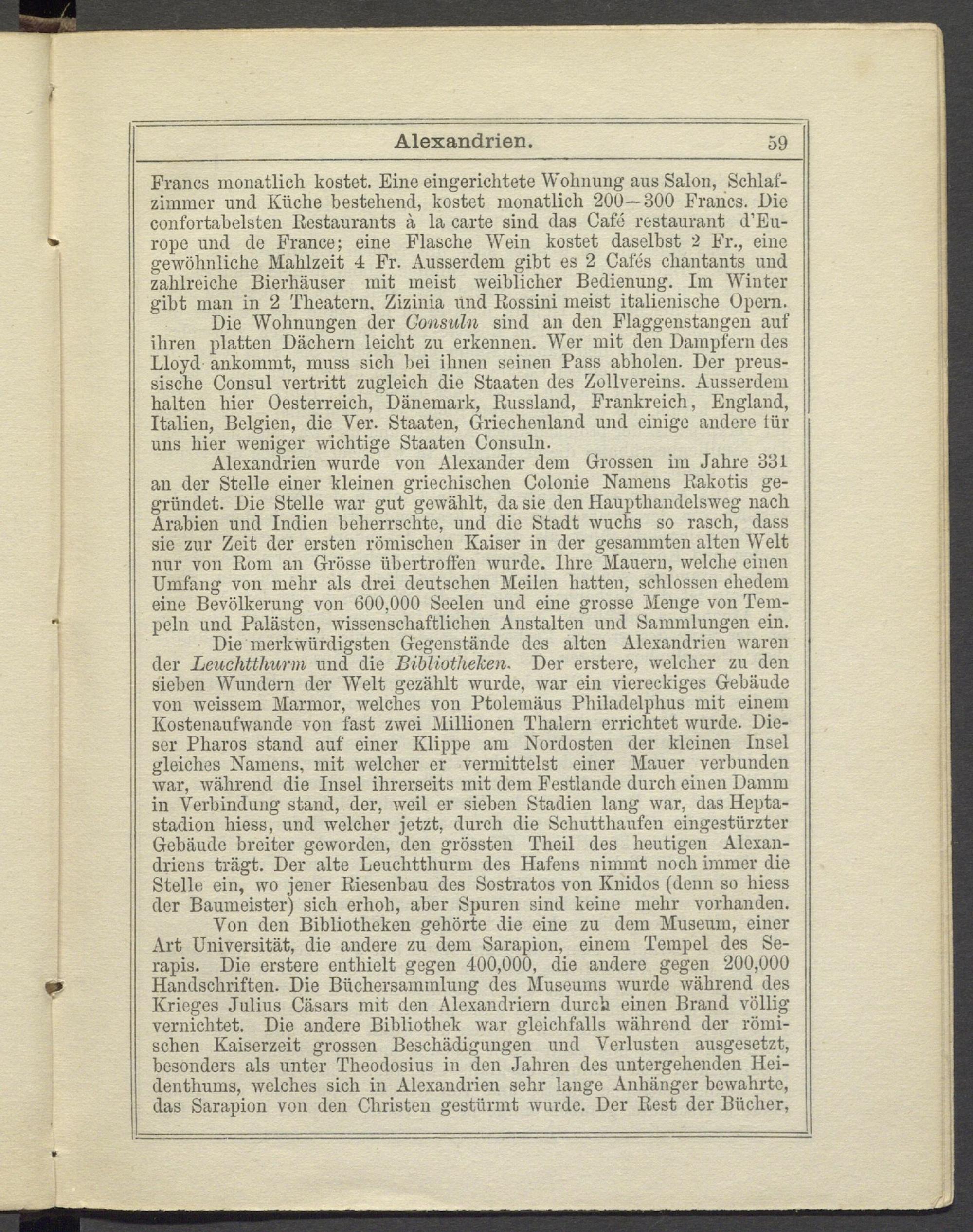 Alexandrien wurde von Alexander dem Grossen im Jahre 331 an der Stelle einer kleinen griechischen Colonie Namens Rakotis gegründet. Die Stelle war gut gewählt, da sie den Haupthandelsweg nach Arabien und Indien beherrschte, und die Stadt wuchs so rasch, dass sie zur Zeit der ersten römischen Kaiser in der gesammten alten Welt nur von Rom an Grösse übertrotten wurde. Ihre Mauern, welche einen Umfang von mehr als drei deutschen Meilen hatten, schlossen ehedem eine Bevölkerung von 600,000 Seelen und eine grosse Menge von Tempeln und Palästen, wissenschaftlichen Anstalten und Sammlungen ein.