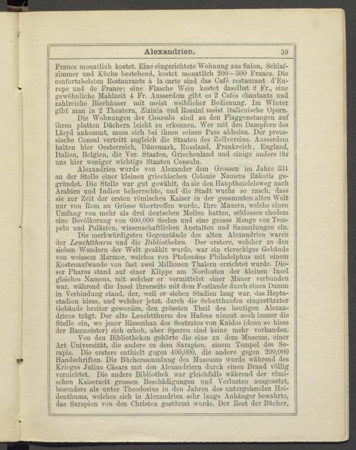 Von den Bibliotheken gehörte die eine zu dem Museum, einer 1 Art Universität, die andere zu dem Sarapion, einem Tempel des Se- rapis. Die erstere enthielt gegen 400,000, die andere gegen 200,000 Handschriften. Die Büchersammlung des Museums wurde während des Krieges Julius Cäsars mit den Alexandriern durch einen Brand völlig vernichtet. Die andere Bibliothek war gleichfalls währond der römischen Kaiserzeit grossen Beschädigungen und Verlusten ausgesetzt, besonders als unter Theodosius in den Jahren des untergehenden Heidenthums, welches sich in Alexandrien sehr lange Anhänger bewahrte, das Sarapion von den Christen gestürmt wurde. Der Rest der Bücher,