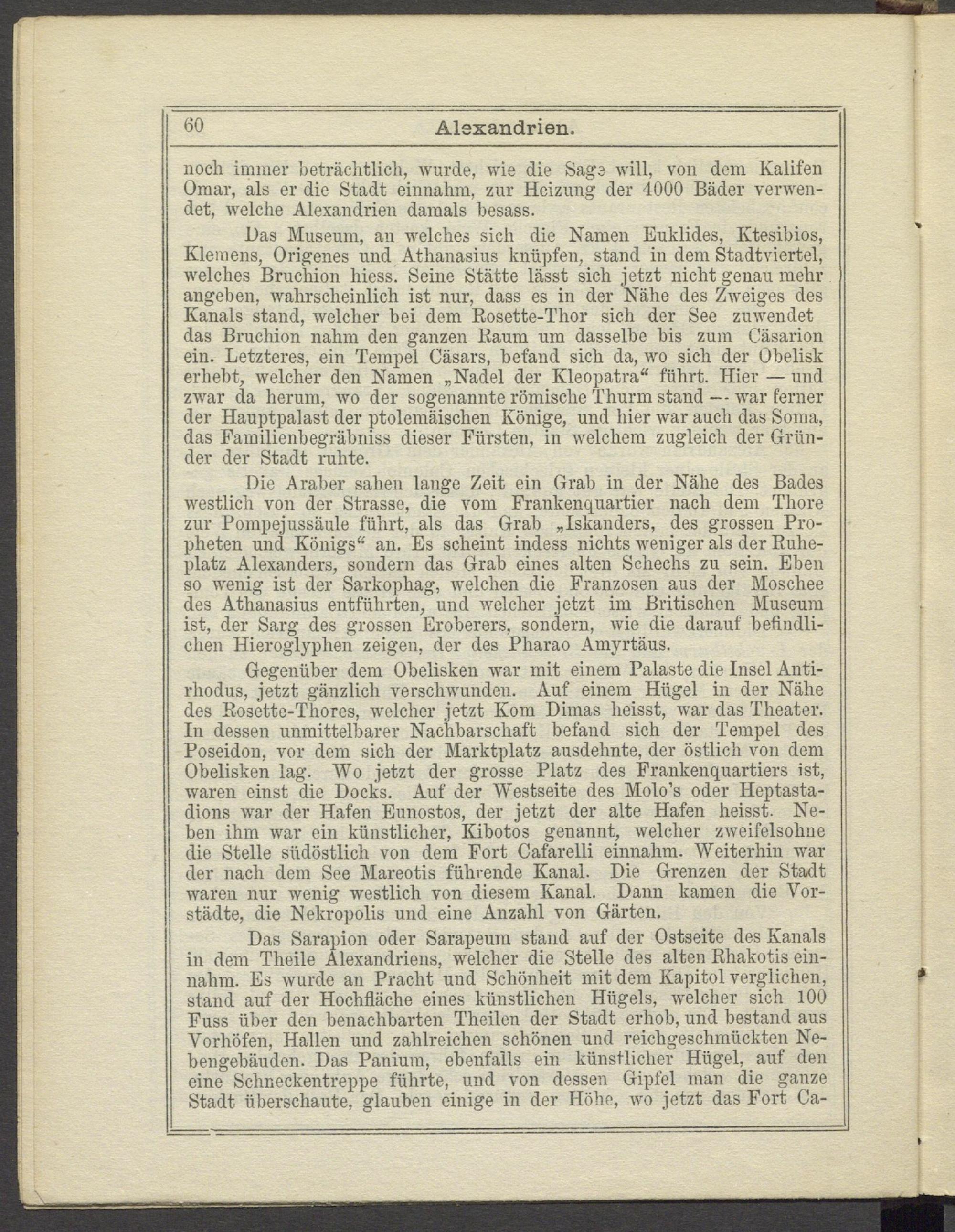 Bas Museum, an welches sich die Namen Euklides, ICtesibios, Klemens, Origenes und Athanasius knüpfen, stand in dem Stadtviertel, welches Bruchion hiess. Seine Stätte lässt sich jetzt nicht genau mehr angeben, wahrscheinlich ist nur, dass es in der Nähe des Zweiges des Kanals stand, welcher bei dem Rosette-Thor sich der See zuwendet das Bruchion nahm den ganzen Kaum um dasselbe bis zum Cäsarion ein. Letzteres, ein Tempel Casars, befand sich da, wo sich der Obelisk erhebt, welcher den Namen „Nadel der Kleopatra“ führt. Hier — und zwar da herum, wo der sogenannte römische Thurm stand — war ferner der Hauptpalast der ptolemäischen Könige, und hier war auch das Soma, das Familienbegräbniss dieser Fürsten, in welchem zugleich der Gründer der Stadt ruhte.