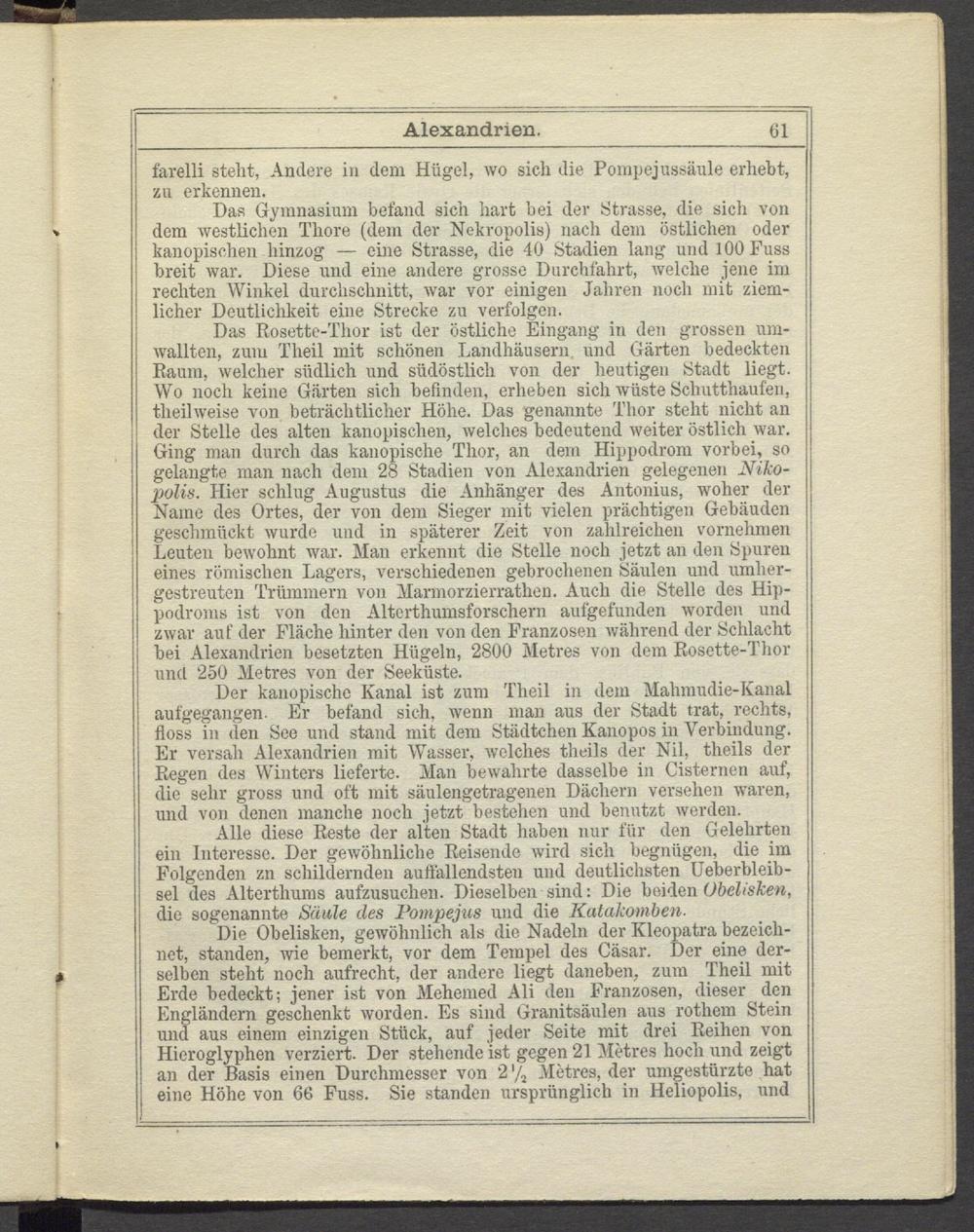 Alle diese Reste der alten Stadt haben nur für den Gelehrten ein Interesse. Der gewöhnliche Reisende wird sich begnügen, die im Folgenden zn schildernden auffallendsten und deutlichsten Ueberbleib- sel des Alterthums aufzusuchen. Dieselben sind: Die beiden Obelisken, die sogenannte Säule des Pompejus und die Katakomben.