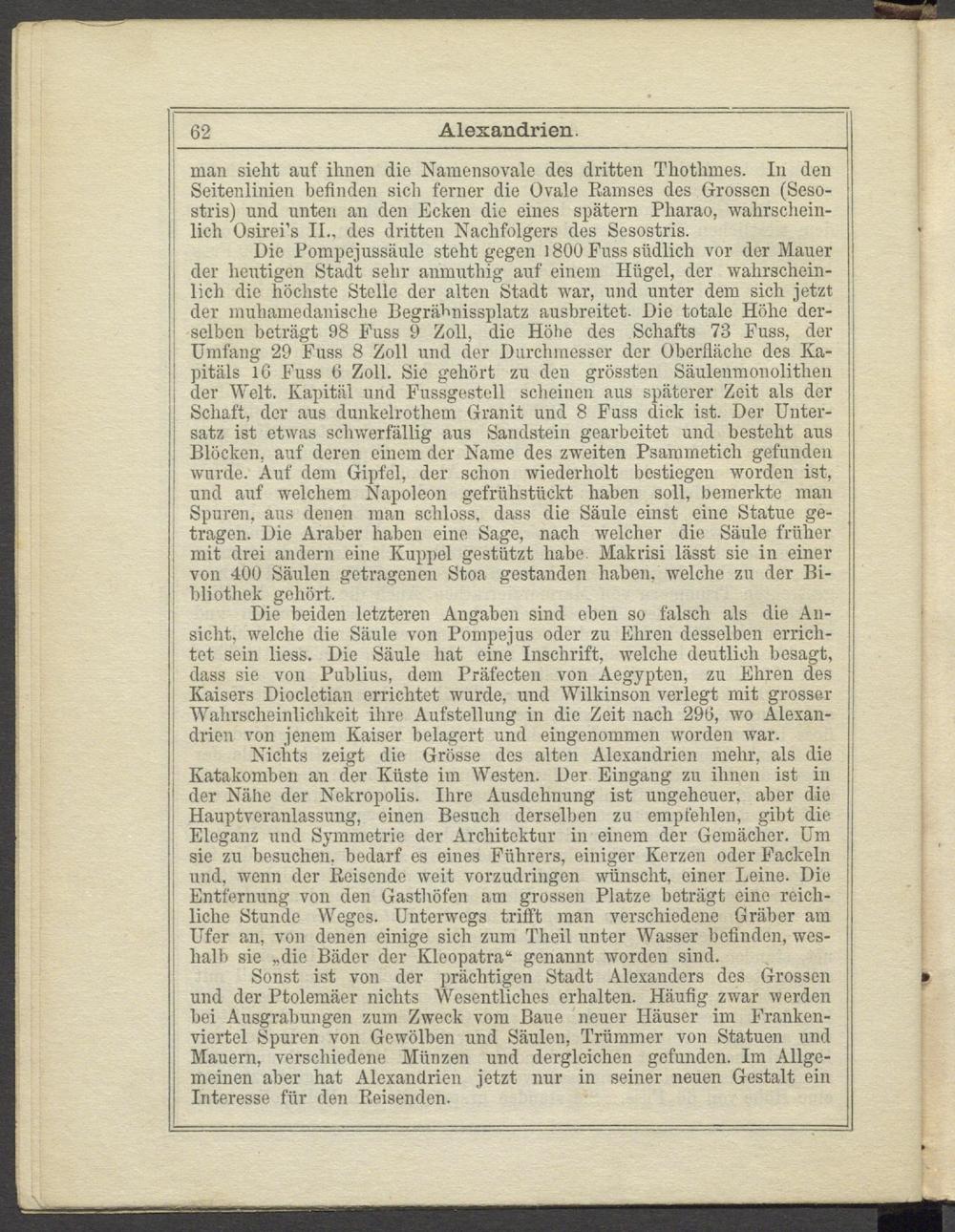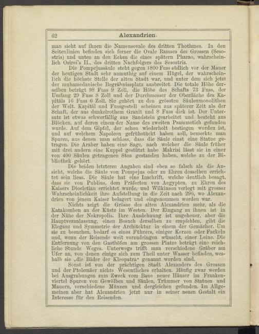 und der Ptolemäer nichts Wesentliches erhalten. Häufig zwar werden hei Ausgrabungen zuin Zweck vom Baue neuer Häuser im Frankenviertel Spuren von Gewölben und Säulen, Trümmer von Statuen und Mauern, verschiedene Münzen und dergleichen gefunden. Im Allgemeinen aber hat Alexandrien jetzt nur in seiner neuen Gestalt ein Interesse für den Reisenden.