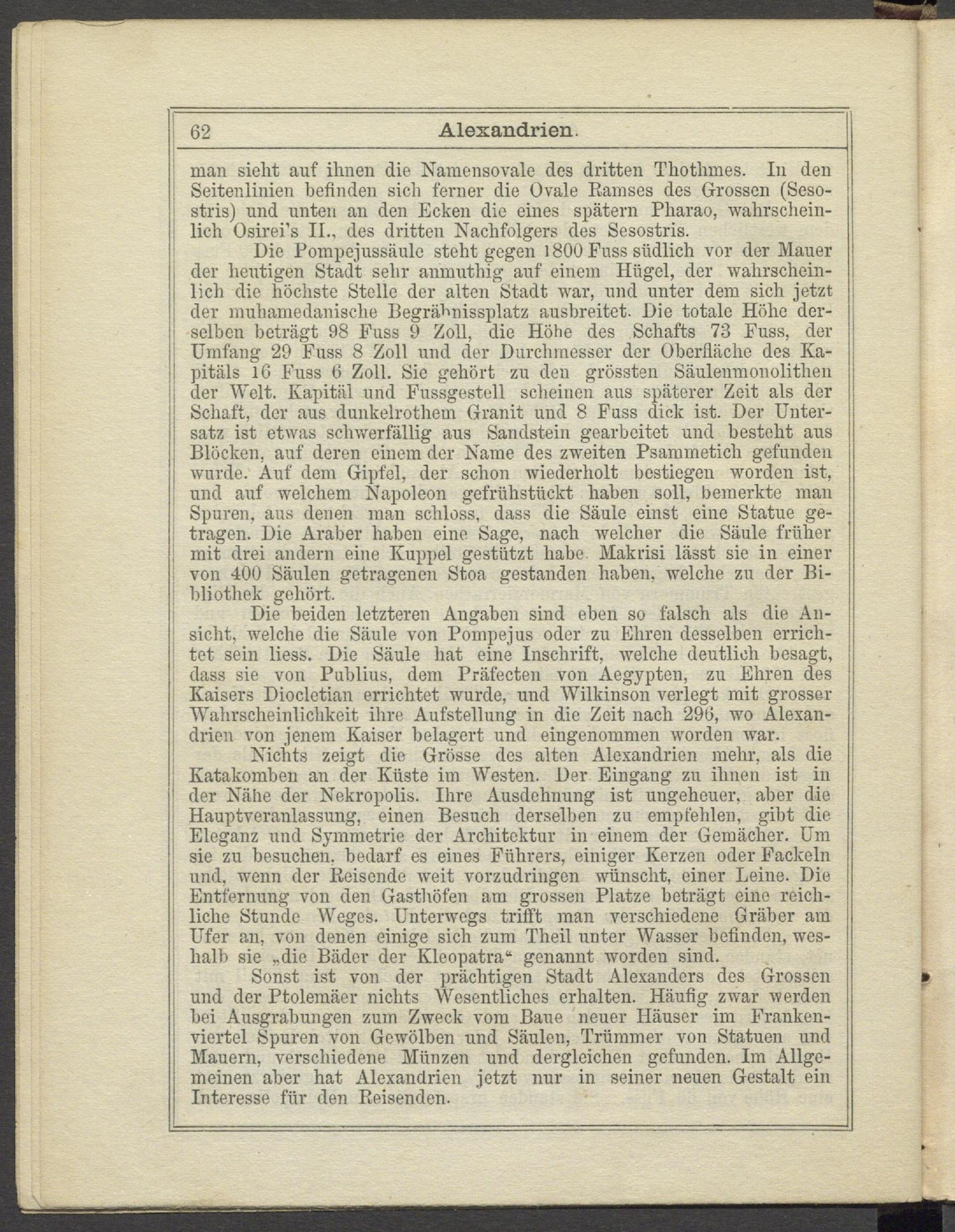 Die beiden letzteren Angaben sind eben so fälsch als die Ansicht, welche die Säule von Poinpejus oder zu Ehren desselben errichtet sein liess. Die Säule hat eine Inschrift, welche deutlich besagt, dass sie von Publius, dem Präfecten von Aegypten, zu Ehren des Kaisers Diocletian errichtet wurde, und Wilkinson verlegt mit grosser Wahrscheinlichkeit ihre Aufstellung in die Zeit nach 296, wo Alexan- j drien von jenem Kaiser belagert und eingenommen worden war.