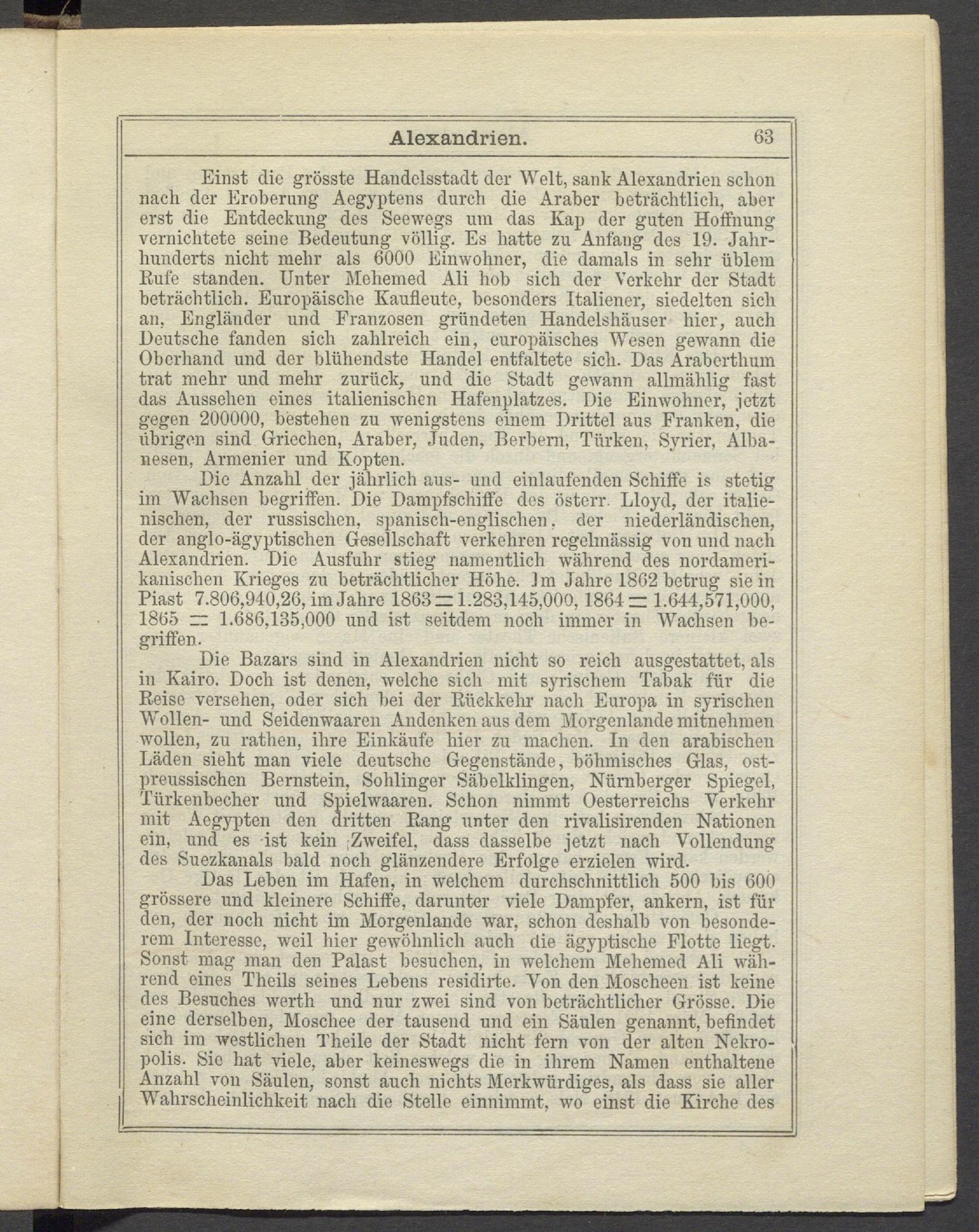 Einst die grösste Handelsstadt der Welt, sank Alexandrien schon nach der Eroberung Aegyptens durch die Araber beträchtlich, aber erst die Entdeckung des Seewegs um das Kap der guten Hoffnung vernichtete seine Bedeutung völlig. Es hatte zu Anfang des 19. Jahrhunderts nicht mehr als 6000 Einwohner, die damals in sehr üblem Eule standen. Unter Meliemed Ali hob sich der Verkehr der Stadt beträchtlich. Europäische Kaufleute, besonders Italiener, siedelten sich an, Engländer und Franzosen gründeten Handelshäuser hier, auch Deutsche fanden sich zahlreich ein, europäisches Wesen gewann die Oberhand und der blühendste Handel entfaltete sich. Das Araberthum trat mehr und mehr zurück, und die Stadt gewann allmählig fast das Aussehen eines italienischen Hafenplatzes. Die Einwohner, jetzt gegen 200000, bestehen zu wenigstens einem Drittel aus Franken', die übrigen sind Griechen, Araber, Juden, Berbern, Türken, Syrier, Albanesen, Armenier und Kopten.