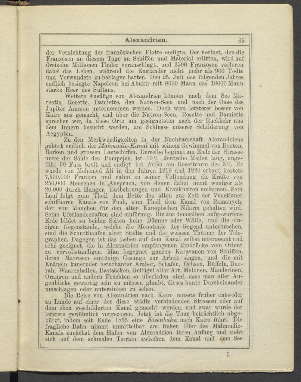 der Vernichtung der französischen Flotte endigte. Der Verlust, den die Franzosen an diesem Tage an Schiffen und Material erlitten, wird auf dreizehn Millionen Thaler veranschlagt, und 3500 Franzosen verloren dabei das Leben, während die Engländer nicht mehr als 900 Todte und Verwundete zu beklagen hatten. Den 25. Juli des folgenden Jahres endlich besiegte Napoleon bei Abukir mit 8000 Mann das 18000 Mann starke Heer des Sultans.
