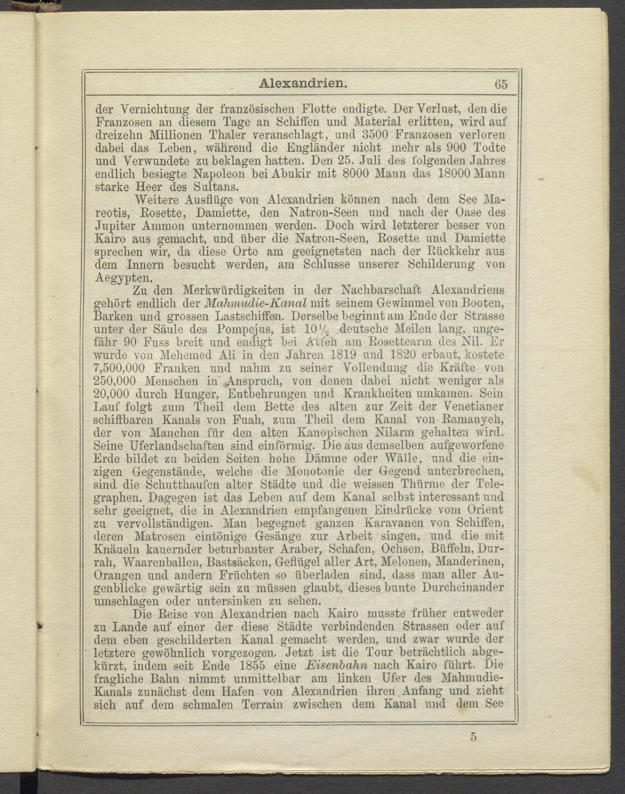 Die Reise von Alexandrien nach Kairo musste früher entweder zu Lande auf einer der diese Städte verbindenden Strassen oder auf dem eben geschilderten Kanal gemacht werden, und zwar wurde der letztere gewöhnlich vorgezogen. Jetzt ist die Tour beträchtlich abgekürzt, indem seit Ende 1855 eine Eisenbahn nach Kairo führt. Die fragliche Bahn nimmt unmittelbar am linken Ufer des Mahmudie- Kanals zunächst dem Hafen von Alexandrien ihren Anfang und zieht sich auf dem schmalen Terrain zwischen dem Kanal und dem See