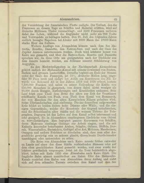 Weitere Ausflüge von Alexandrien können nach dem See Ma- reotis, Rosette, Damiette, den Natron-Seen und nach der Oase des Jupiter Ammon unternommen werden. Doch wird letzterer besser von Kairo aus gemacht, und über die Natron-Seen, Rosette und Damiette sprechen wir, da diese Orte am geeignetsten nach der Rückkehr aus dem Innern besucht werden, am Sclilusse unserer Schilderung von Aegypten.