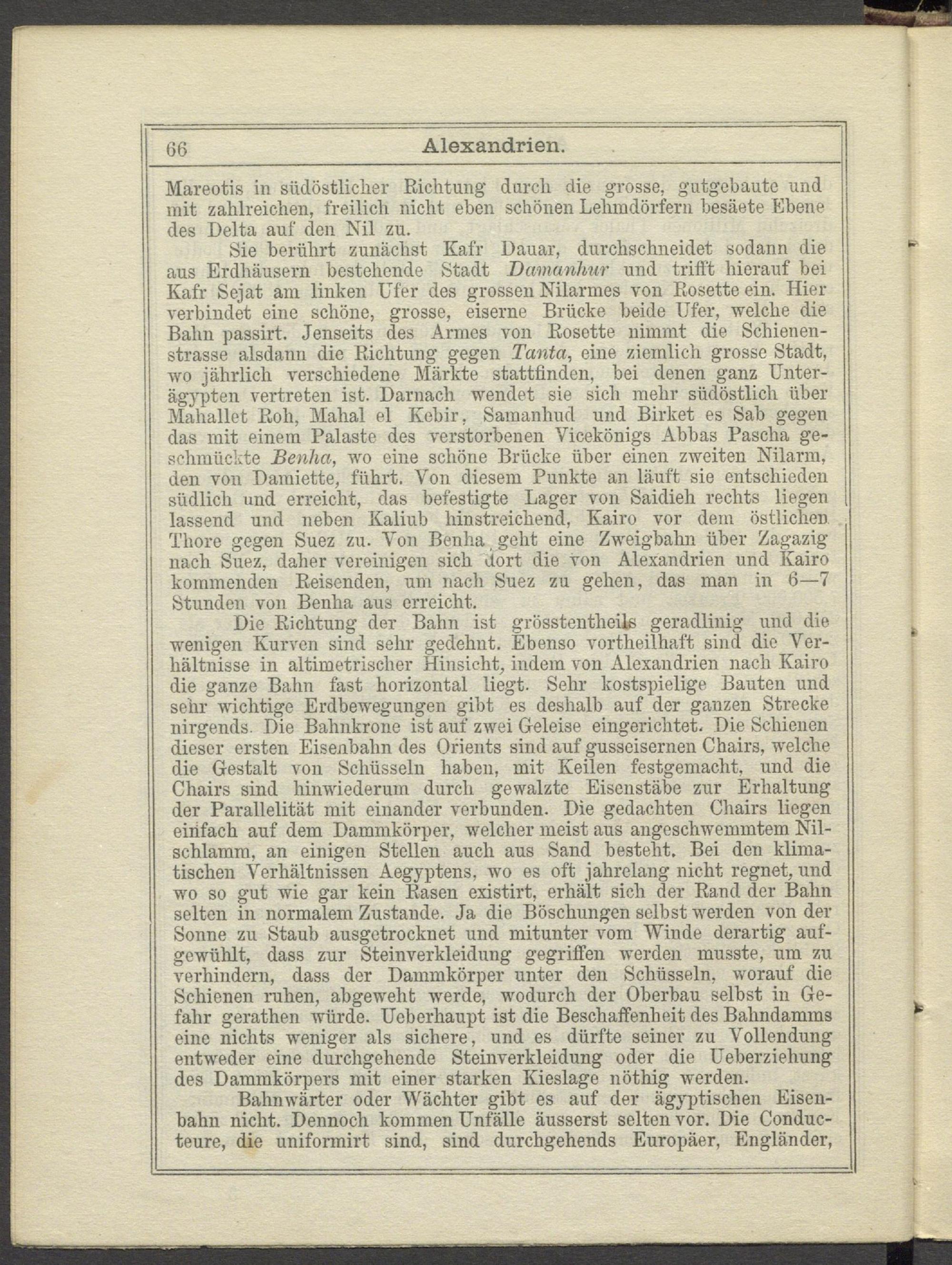 Sie berührt zunächst Kafr Dauar, durchschneidet sodann die aus Erdhäusern bestehende Stadt Damanhur und trifft hierauf bei Kafr Sejat am linken Ufer des grossen Nilarmes von Rosette ein. Hier verbindet eine schöne, grosse, eiserne Brücke beide Ufer, welche die Bahn passirt. Jenseits des Armes von Rosotte nimmt die Schienenstrasse alsdann die Richtung gegen Tanta, eine ziemlich grosse Stadt, wo jährlich verschiedene Märkte stattfinden, bei denen ganz Unterägypten vertreten ist. Darnach wendet sie sich mehr südöstlich über Mahallet Roh, Mahal el Kebir, Samanluid und Birket es Sab gegen das mit einem Palaste des verstorbenen Vicekönigs Abbas Pascha geschmückte Benha, wo eine schöne Brücke über einen zweiten Nilarm, den von Damiette, führt. Von diesem Punkte an läuft sie entschieden südlich und erreicht, das befestigte Lager von Saidieh rechts liegen lassend und neben Kaliub hinstreichend, Kairo vor dem östlichen Thore gegen Suez zu. Von Benha geht eine Zweigbahn über Zagazig nach Suez, daher vereinigen sich dort die von Alexandrien und Kairo kommenden Reisenden, um nach Suez zu gehen, das man in 6—7 Stunden von Benha aus erreicht.