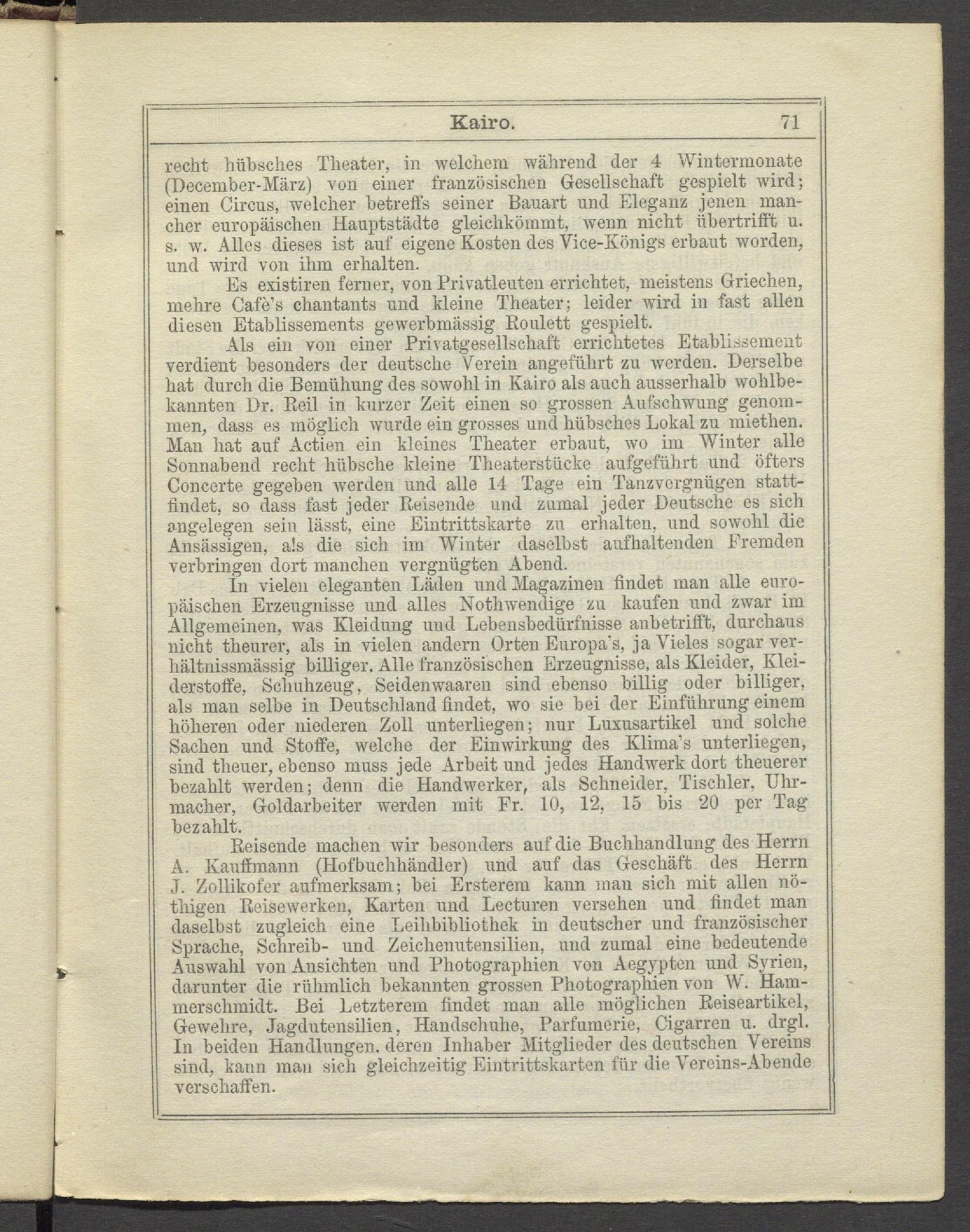 Reisende machen wir besonders auf die Buchhandlung des Herrn A. Kaufimann (Hofbuchhändler) und auf das Geschäft des Herrn J. Zollikofer aufmerksam; bei Ersterem kann mau sich mit allen nö- thigen Reisewerken, Karten und Lecturen versehen und findet man daseihst zugleich eine Leihbibliothek in deutscher und französischer Sprache, Schreib- und Zeichenutensilien, und zumal eine bedeutende Auswahl von Ansichten und Photographien von Aegypten und Syrien, darunter die rühmlich bekannten grossen Photographien von W. Hammerschmidt. Bei Letzterem findet man alle möglichen Reiseartikel, Gewehre, Jagdutensilien, Handschuhe, Parfümerie, Cigarren u. drgl. In beiden Handlungen, deren Inhaber Mitglieder des deutschen Vereins sind, kann man sich gleichzeitig Eintrittskarten für die Vereins-Abende verschaffen.