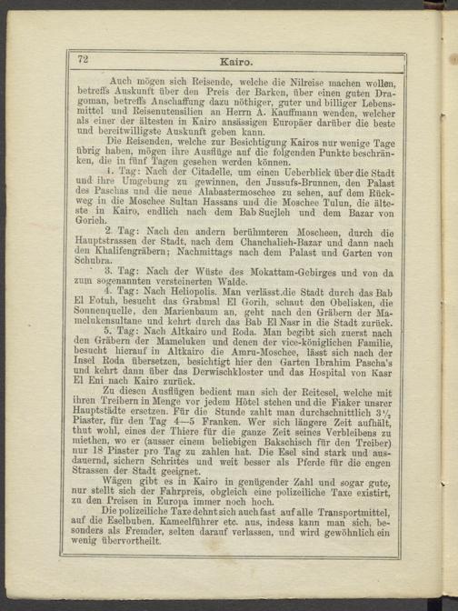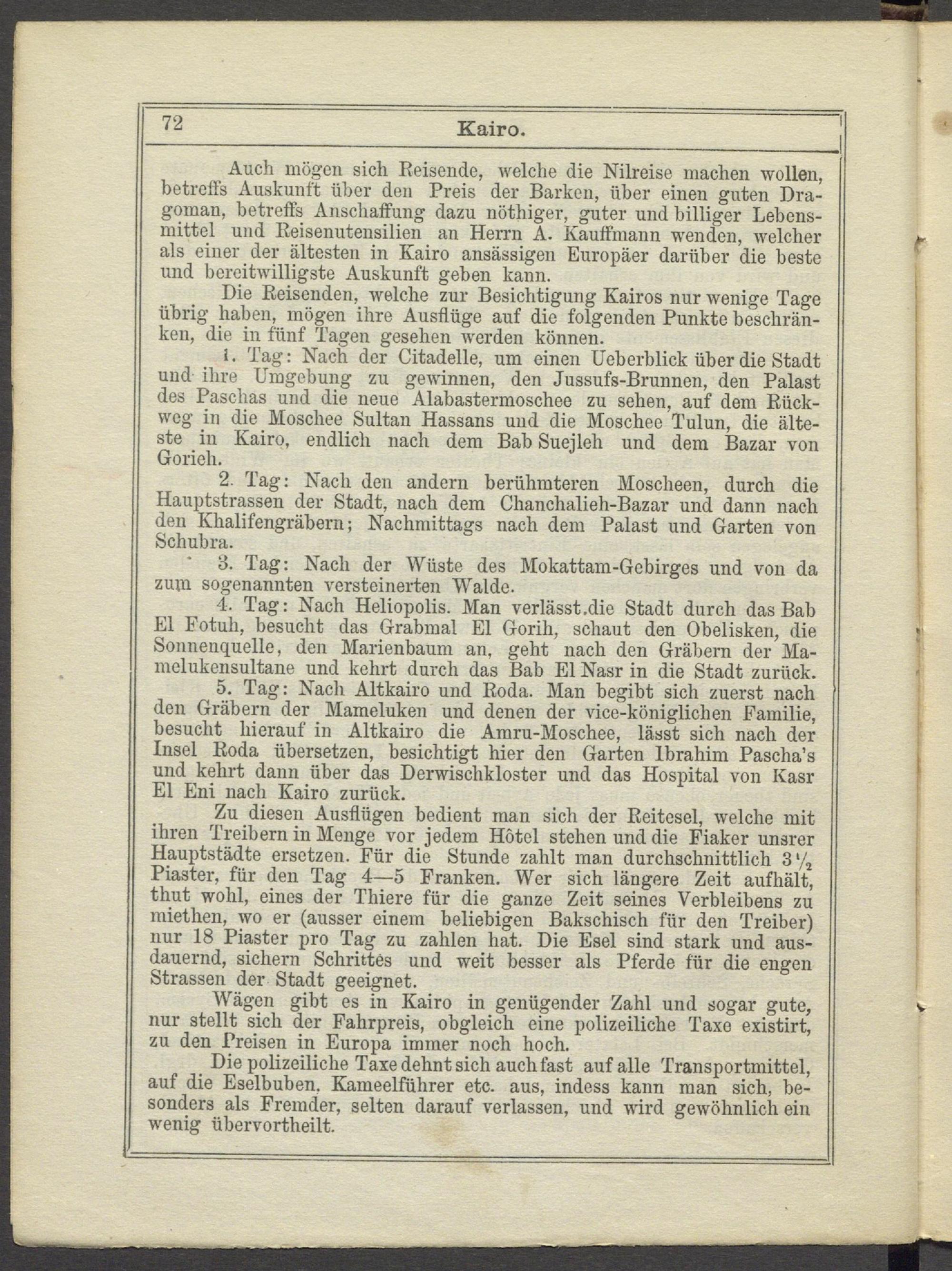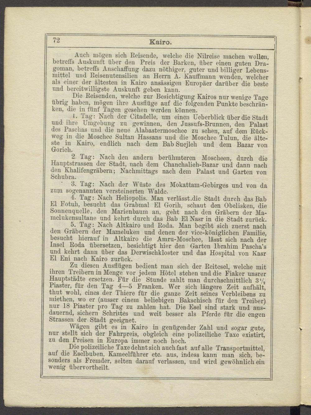Die Reisenden, welche zur Besichtigung Kairos nur wenige Tage übrig haben, mögen ihre Ausflüge auf die folgenden Punkte beschränken, die in fünf Tagen gesehen werden können.