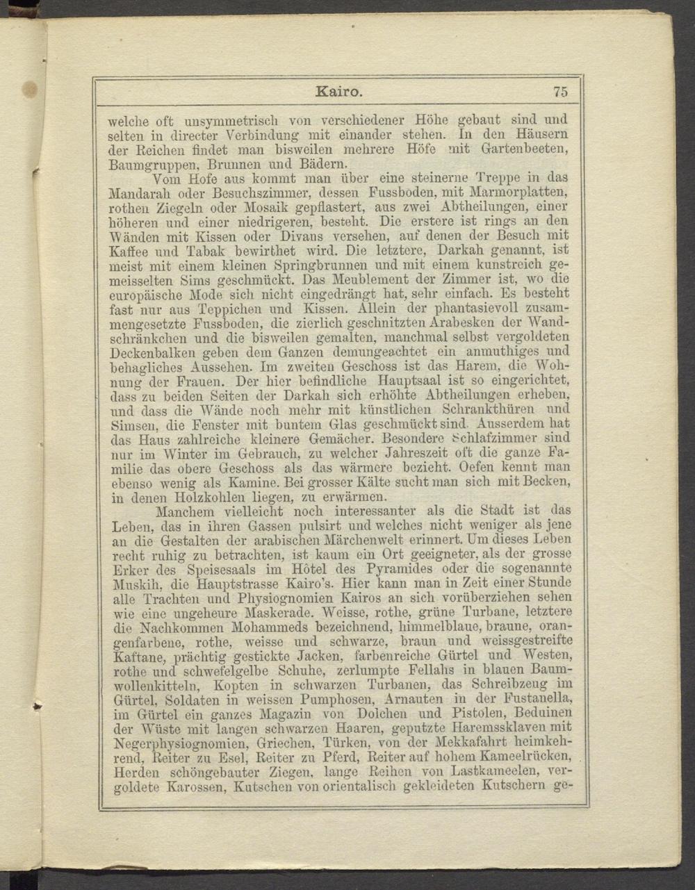 Manchem vielleicht noch interessanter als die Stadt ist das Leben, das in ihren Gassen pulsirt und welches nicht weniger als jene an die Gestalten der arabischen Märchenwelt erinnert. Um dieses Leben recht ruhig zu betrachten, ist kaum ein Ort geeigneter, als der grosse Erker des Speisesaals im Hotel des Pyramides oder die sogenannte Muskili, die Hauptstrasse Kairo’s. Hier kann man in Zeit einer Stunde alle Trachten und Physiognomien Kairos an sich vorüberziehen sehen wie eine ungeheure Maskerade. Weisse, rothe, grüne Turbane, letztere die Nachkommen Mohammeds bezeichnend, himmelblaue, braune, orangenfarbene, rothe, weisse und schwarze, braun und weissgestreifte Kaftane, prächtig gestickte Jacken, farbenreiche Gürtel und Westen, rothe und schwefelgelbe Schuhe, zerlumpte Fellahs in blauen Baumwollenkitteln, Kopten in schwarzen Turbanen, das Schreibzeug im Gürtel, Soldaten in weissen Pumphosen, Arnauten in der Fustanella, im Gürtel ein ganzes Magazin von Dolchen lind Pistolen, Beduinen der Wüste mit langen schwarzen Haaren, geputzte Haremssklaven mit Negerphysiognomien, Griechen, Türken, von der Mekkafahrt heimkehrend, Reiter zu Esel, Reiter zu Pferd, Reiter auf hohem Kameelrücken, Herden schöngebauter Ziegen, lange Reihen von Lastkameelen, vergoldete Karossen, Kutschen von orientalisch gekleideten Kutschern ge-