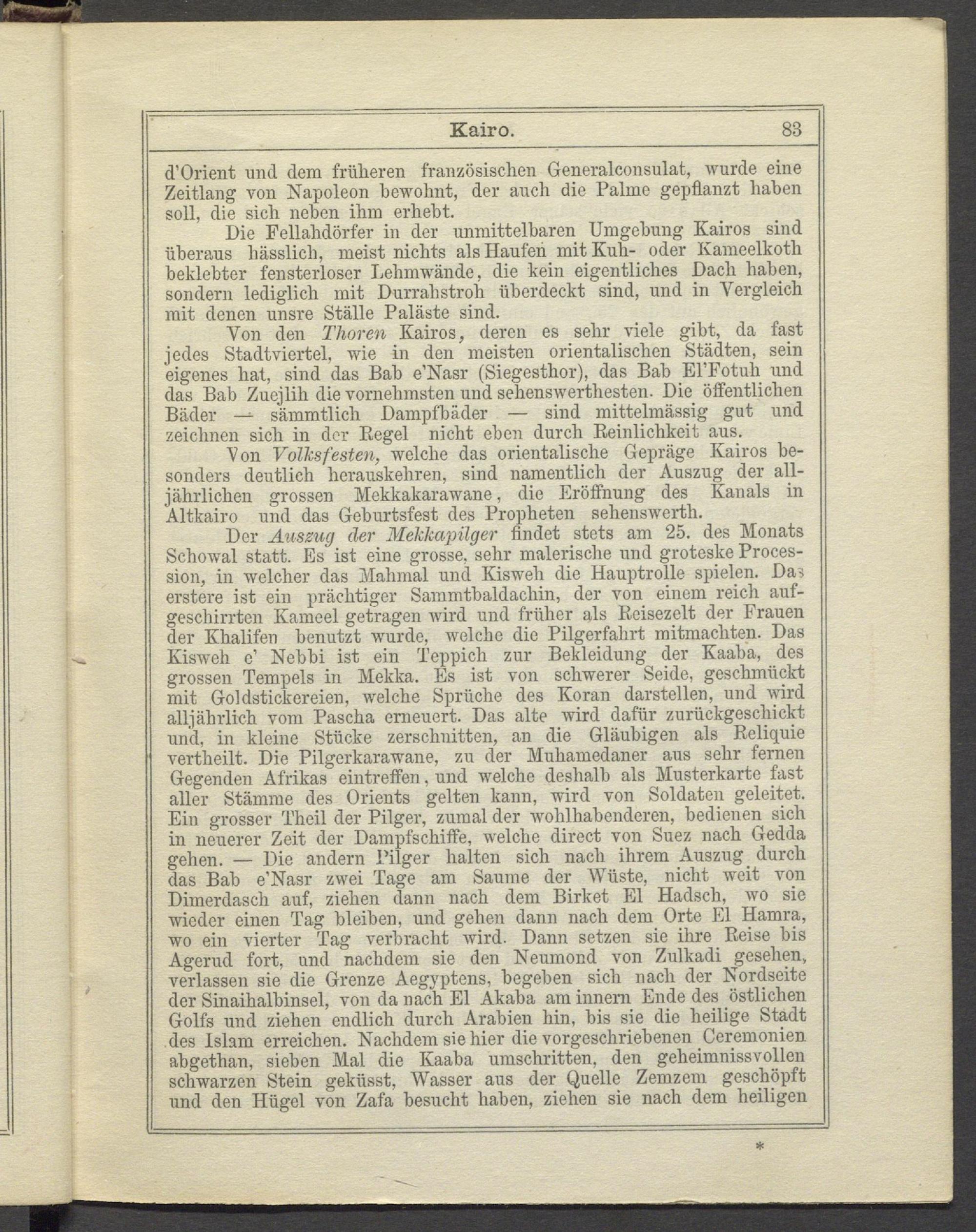 Von den Thoren Kairos, deren es sehr viele gibt, da fast jedes Stadtviertel, wie in den meisten orientalischen Städten, sein eigenes hat, sind das Bab e’Nasr (Siegesthor), das Bab Bl’Potuh und das Bab Zuejlih die vornehmsten und sehenswertliesten. Die öffentlichen Bäder sämmtlich Dampfbäder — sind mittelmässig gut und zeichnen sich in der Kegel nicht eben durch Reinlichkeit aus.