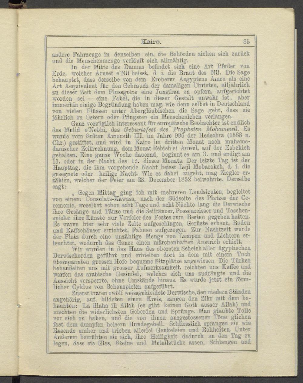 Ganz vorzüglich interessant für europäische Beobachter ist endlich das Muiid e’Nebbi, das Sebmtsfest des Propheten Mohammed. Es wurde vom Sultan Arenrath III. im Jahre 998 der Hedschra (1588 n. Chr.) gestiftet, und wird in Kairo im dritten Monat nach muhame- danischer Zeitrechnung, dem Monat Sebieh el Auwel, auf der Esbekieh geharten. Eine ganze Woche dauernd, beginnt es am 3. und endigt am 11 . oder in der Nacht des 13. dieses Monats. Der letzte Tag ist der Hauptlag, die ihm vorgehende Nacht heisst Lejl Mobarakeh, d. i. die gesegnete oder heilige Nacht. Wie es dabei zugeht, mag Ziegler erzählen, welcher der Feier am 23. December 1852 bewohnte. Derselbe sagt: