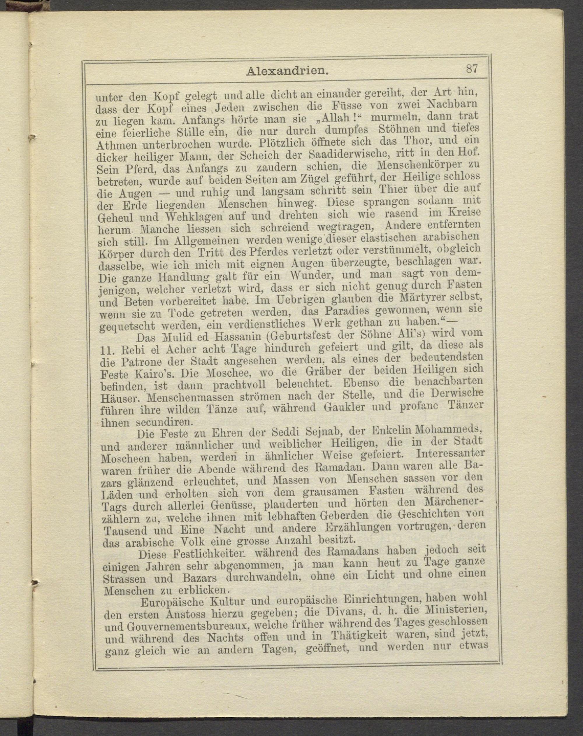 Die Feste zu Ehren der Seddi Sejnab, der Enkelin Mohammeds, und anderer männlicher und weiblicher Heiligen, die in der Stadt Moscheen haben, werden in ähnlicher Weise gefeiert. Interessanter waren früher die Abende während des Ramadan. Dann waren alle Bazars glänzend erleuchtet, und Massen von Menschen sassen vor den Läden und erholten sich von dem grausamen Pasten während des Tags durch allerlei Genüsse, plauderten und hörten den Märchenerzählern za, welche ihnen mit lebhaften Geherden die Geschichten von Tausend und Eine Nacht und andere Erzählungen vortrugen, deren das arabische Volk eine grosse Anzahl besitzt.
