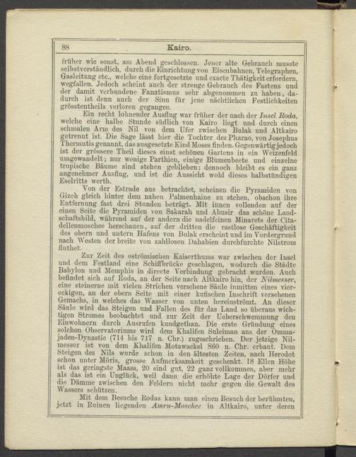 Zur Zeit des oströmischen Kaisei'thums war zwischen der Insel und dem Festland eine Schiffbrücke geschlagen, wodurch die Städte Babylon und Memphis in directe Verbindung gebracht wurden. Auch befindet sich auf Boda, an der Seite nach Altkairo hin, der Nihnesser, eine steinerne mit vielen Strichen versehene Säule inmitten eines viereckigen, an der obern Seite mit einer kufischen Inschrift versehenen Gemachs, in welches das Wasser von unten hereinströmt. An dieser Säule wird das Steigen und Fallen des für das Land so überaus wichtigen Stromes beobachtet und zur Zeit der Ueberschwemmung den Einwohnern durch Ausrufen kundgetlian. Die erste Gründung eines solchen Observatoriums wird dem Khalifen Suleiman aus der Oimiia- jaden-Dynastie (714 bis 717 n. Chr.) zugeschrieben. Der jetzige Nilmesser ist von dem Khalifen Motawackel 860 n. Chr. erbaut. Dem Steigen des Nils wurde schon in den ältesten Zeiten, nach Ilerodot schon unter Möris, grosse Aufmerksamkeit geschenkt. 18 Ellen Höhe ist das geringste Maass, 20 sind gut, 22 ganz vollkommen, aber mehr als das ist ein Unglück, weil dann die erhöhte Lage der Dörfer und die Dämme zwischen den Feldern nicht mehr gegen die Gewalt des Wassers schützen.