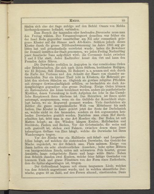 Zum Besuch der tanzenden oder heulenden Derwische muss man den Freitag wählen. Der Versammlungsort desselben war früher ein der Insel Roda gegenüber unmittelbar am Nil sehr romantisch gelegenes Kloster auf der Strasse nach Alt-Kairo. Seitdem jedoch dieses Kloster durch die grosse Nilüberschwemmung im Jahre 1863 arg gelitten hat und grösstentheils verwüstet wurde, haben die Bewohner ihr Domicil inmitten der Stadt genommen, wo jeden Freitag Nachmittag jener fanatische Tanz aufgeführt wird; die Ceremonie findet zwischen 2 und 3 Uhr statt. Jeder Eseltreiber kennt den Ort und kann den Fremden dahin fahren.