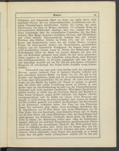 Nilakazien und Sykomoren führt von Kairo aus dahin durch wohl angebaute Fluren, die von weissschimmernden Landhäusern und einzelnen Palmengruppen unterbrochen werden. Der Garten, der einen Flächenraum von circa 14 Morgen einnimmt, ist seltsamer Weise im altfranzösischen Eokokostyle angelegt, aber man vergisst den Zopf dieses Geschmacks über der orientalischen Vegetation, die ihn überwuchert. Eine Menge tropischer Gewächse, Citronen- und Olivenbäume und selbst indische Limonensträuche kommen hier mit schönen I Früchten oder Blüthen beladen im Freien fort, und die reizenden Rosen- und Geranienbeete, neben den mit bunten Steinen belegten Wegen, die Farbenpracht anderer mit Wasserkünsten geschmückter Anlagen und der balsamische Wohlgeruch des Ganzen bieten einen nicht gewöhnlichen Genuss, zumal im Winter. Der Mittelpunkt dieses Zaubergartens bildet ein Basin von grauem Marmor, aus dem sich eine von Krokodilen getragene Insel erhebt, die mit einem glänzenden Gitter umgeben ist. Der hier befindliche schöne Kiosk, einst Mehemed Alis Lieblingsaufenthalt, ist Fremden zugänglich, und man hat hier eine anmuthige Aussicht auf den Nil. Die mit dem Garten verbundene Menagerie ist unbedeutend. Der Palast bietet ebenfalls wenig Sehens- werthes.