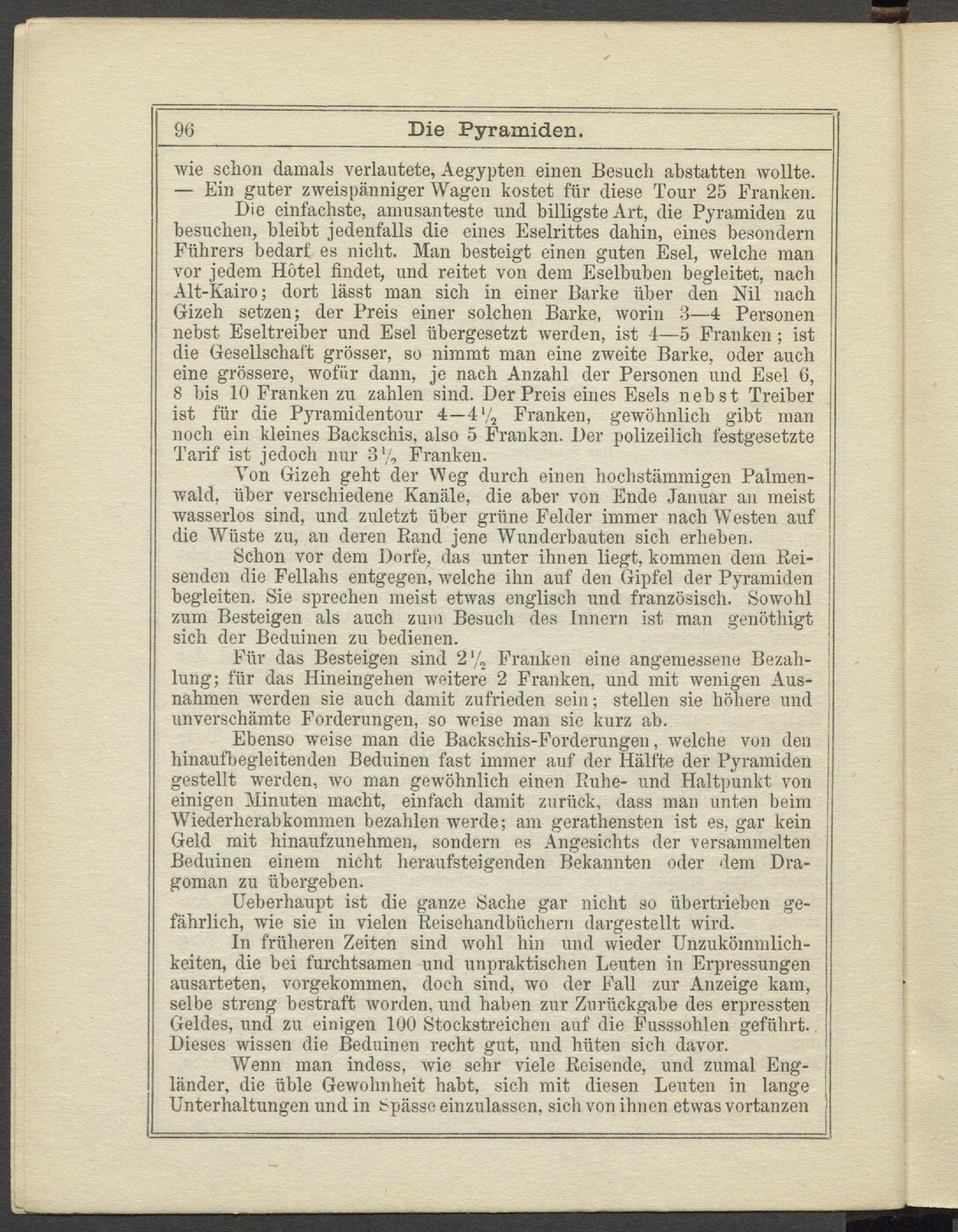 Die einfachste, amüsanteste und billigste Art, die Pyramiden zu besuchen, bleibt jedenfalls die eines Eselrittes dahin, eines besondern Führers bedarf es nicht. Man besteigt einen guten Esel, welche man vor jedem Hotel findet, und reitet von dem Eselbuben begleitet, nach Alt-Kairo; dort lässt man sich in einer Barke über den Nil nach Gizeh setzen; der Preis einer solchen Barke, worin 3—4 Personen nebst Eseltreiber und Esel übergesetzt werden, ist 4—5 Franken; ist die Gesellschaft grösser, so nimmt man eine zweite Barke, oder auch eine grössere, wofür dann, je nach Anzahl der Personen und Esel (j, 8 bis 10 Franken zu zahlen sind. Der Preis eines Esels nebst Treiber ist für die Pyramidentour 4—4% Franken, gewöhnlich gibt man noch ein kleines Backschis, also 5 Franken. Der polizeilich festgesetzte Tarif ist jedoch nur 3 1 /, Franken.