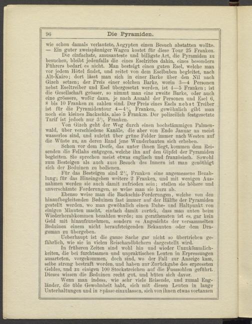 Ebenso weise man die Backschis-Forderungen, welche von den hinaufbegleitenden Beduinen fast immer auf der Hälfte der Pyramiden gestellt werden, wo man gewöhnlich einen Ruhe- und Haltpunkt von einigen Minuten macht, einfach damit zurück, dass man unten beim Wiederherabkommen bezahlen werde; am gerathensten ist es, gar kein Geld mit hinaufzunehmen, sondern es Angesichts der versammelten Beduinen einem nicht heraufsteigenden Bekannten oder dem Dra- goman zu übergeben.