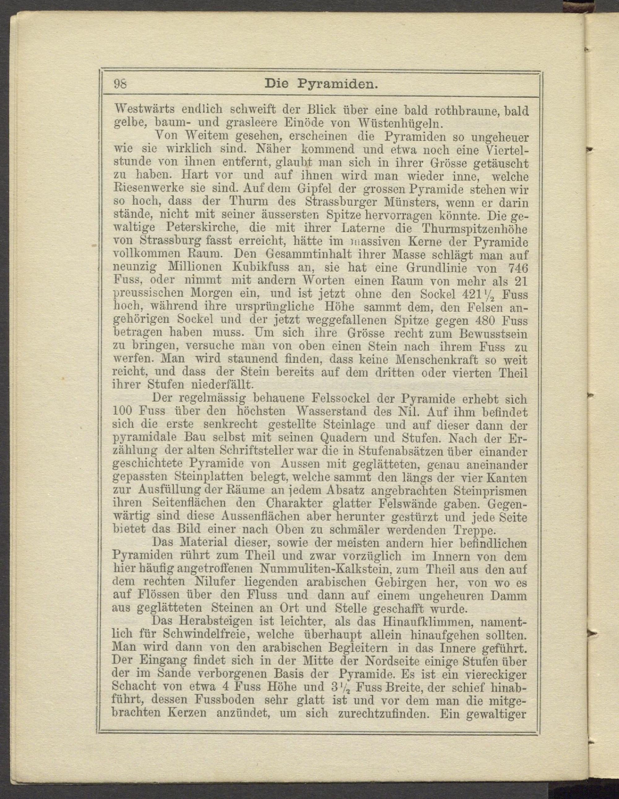Yon Weitem gesehen, erscheinen die Pyramiden so ungeheuer wie sie wirklich sind. Näher kommend und etwa noch eine Viertelstunde von ihnen entfernt, glaubt man sich in ihrer Grösse getäuscht zu haben. Hart vor und auf ihnen wird man wieder inne, welche Riesenwerke sie sind. Auf dom Gipfel der grossen Pyramide stehen wir so hoch, dass der Thurm des Strassburger Münsters, wenn er darin stände, nicht mit seiner äussersten Spitze hervorragen könnte. Die gewaltige Peterskirche, die mit ihrer Laterne die Thurmspitzenhöhe von Strassburg fasst erreicht, hätte im massiven Kerne der Pyramide vollkommen Raum. Den Gesammtiulialt ihrer Masse schlägt man auf neunzig Millionen Kubikfuss an, sie hat eine Grundlinie von 746 Fuss, oder nimmt mit andern Worten einen Raum von mehr als 21 preussischen Morgen ein, und ist jetzt ohne den Sockel 421 '/ 2 Fuss hoch, während ihre ursprüngliche Höhe sammt dem, den Felsen an- gehörigen Sockel und der jetzt weggefallenen Spitze gegen 480 Fuss betragen haben muss. Um sich ihre Grösse recht zum Bewusstsein zu bringen, versuche man von oben einen Stein nach ihrem Fuss zu werfen. Man wird staunend finden, dass keine Menschenkraft so weit reicht, und dass der Stein bereits auf dem dritten oder vierten Theil ihrer Stufen niederfällt.