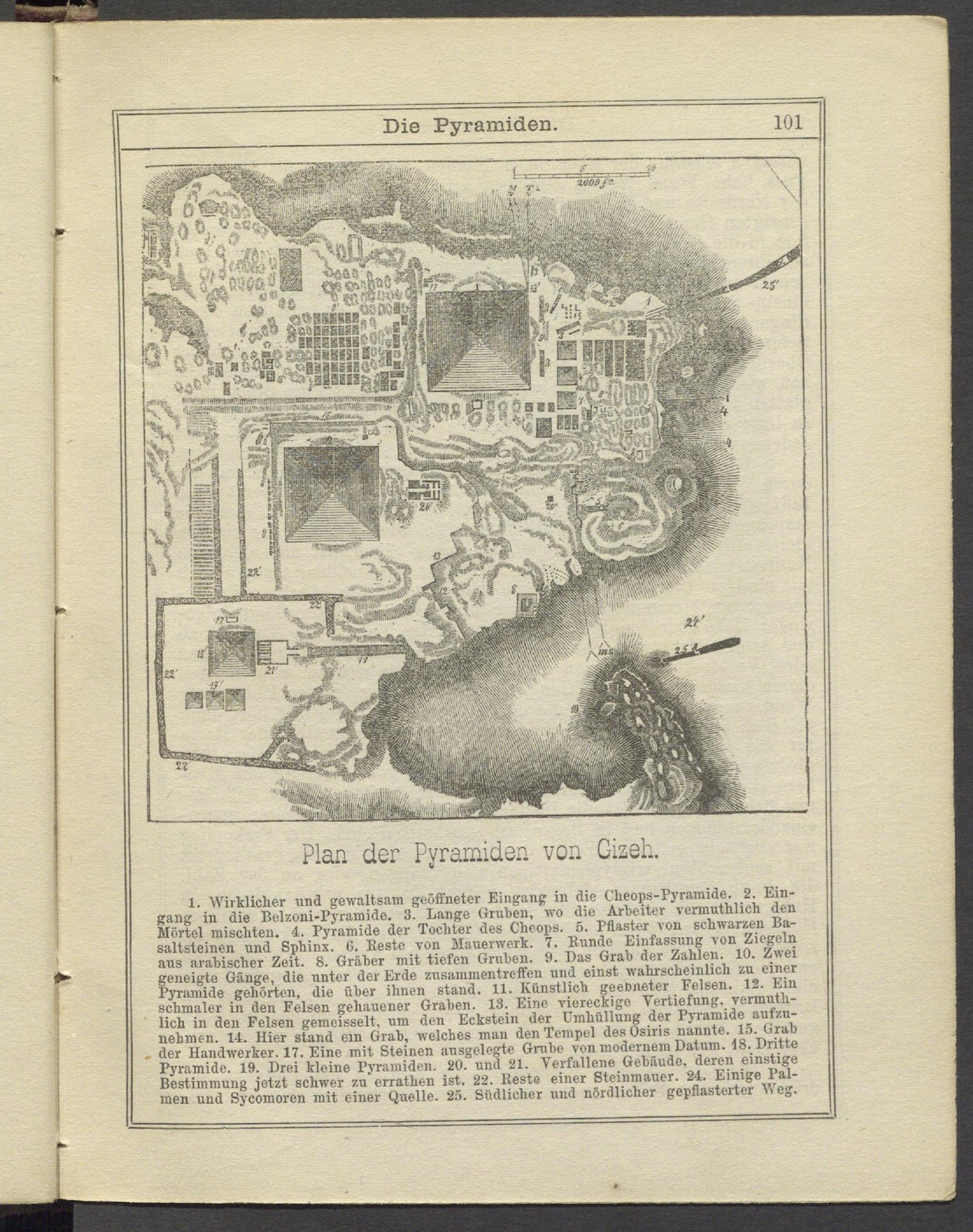 1. Wirklicher und gewaltsam geöffneter Eingang in die Cheops-Pyramide. 2. Eingang in die Belzoni-Pyrannde. 3. Lange Gruben, wo die Arbeiter vermuthlich den Mörtel mischten. 4. Pyramide der Tochter des Cheops. 5. Pflaster von schwarzen Basaltsteinen und Sphinx. 0. Reste von Mauerwerk. 7. Runde Einfassung von Ziegeln ans arabischer Zeit. 8. Gräber mit tiefen Gruben. 9. Das Grab der Zahlen. 10. Zwei geneigte Gänge, die unter der Erde Zusammentreffen und einst wahrscheinlich zu einer Pyramide gehörten, die über ihnen stand. 11. Künstlich geebneter Felsen. 12. Ein schmaler in den Felsen gehauener Graben. 13. Eine viereckige Vertiefung, vermuthlich in den Felsen gemeisselt, um den Eckstein der Umhüllung der Pyramide aufzunehmen. 14. Hier stand ein Grab, welches man den Tempel des Osiris nannte. 15. Grab der Handwerker. 17. Eine mit Steinen ansgelegte Grube von modernem Datum. 18..Dritte Pyramide. 19. Drei kleine Pyramiden. 20. und 21. Verfallene Gebäude, deren einstige Bestimmung jetzt schwer zu errathen ist. 22. Reste einer Steinmauer. 24. Einige Palmen und S ycomoien mit einer Quelle. 25. Südlicher und nördlicher gepflasterter Weg.