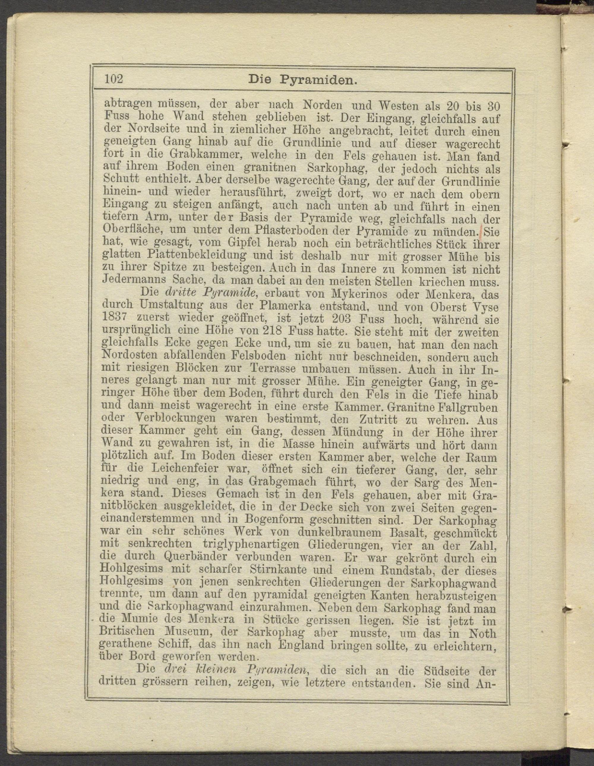 Die dritte Pyramide, erbaut von Mykerinos oder Menkera, das durch Umstaltung aus der Plamerka entstand, und von Oberst Vyse 1837 zuerst wieder geöffnet, ist jetzt 203 Fuss hoch, während sie ursprünglich eine Höhe von 218 Fuss hatte. Sie steht mit der zweiten gleichfalls Ecke gegen Ecke und, um sie zu bauen, hat man den nach Nordosten abfallenden Felsboden nicht nur beschneiden, sondern auch mit riesigen Blöcken zur Terrasse umbauen müssen. Auch in ihr Inneres gelangt man nur mit grosser Mühe. Ein geneigter Gang, in geringer Höhe über dem Boden, führt durch den Fels in die Tiefe hinab und dann meist wagerecht in eine erste Kammer. Granitno Fallgruben oder Verblockungen waren bestimmt, den Zutritt zu wehren. Aus dieser Kammer geht ein Gang, dessen Mündung in der Höhe ihrer Wand zu gewahren ist, in die Masse hinein aufwärts und hört dann plötzlich auf. Im Boden dieser ersten Kammer aber, welche der Raum für die Leichenfeier war, öffnet sich ein tieferer Gang, der, sehr niedrig und eng, in das Grabgemach führt, wo der Sarg des Menkera stand. Dieses Gemach ist in den Fels gehauen, aber mit Granitblöcken ausgekleidet, die in der Decke sich von zwei Seiten gegeneinanderstemmen und in Bogenform geschnitten sind. Der Sarkophag war ein sehr schönes Werk von dunkelbraunem Basalt, geschmückt mit senkrechten triglyphenartigen Gliederungen, vier an der Zahl, die durch Querbänder verbunden waren. Er war gekrönt durch ein Hohlgesims mit scharfer Stirnkante und einem Rundstab, der dieses Hohlgesims von jenen senkrechten Gliederungen der Sarkophagwand trennte, um dann auf den pyramidal geneigten Kanten herabzusteigen und die Sarkophagwand einzurahmen. Neben dem Sarkophag fand man die Mumie des Menkera in Stücke gerissen liegen. Sie ist jetzt im Britischen Museum, der Sarkophag aber musste, um das in Noth gerathene Schiff, das ihn nach England bringen sollte, zu erleichtern, über Bord geworfen werden.