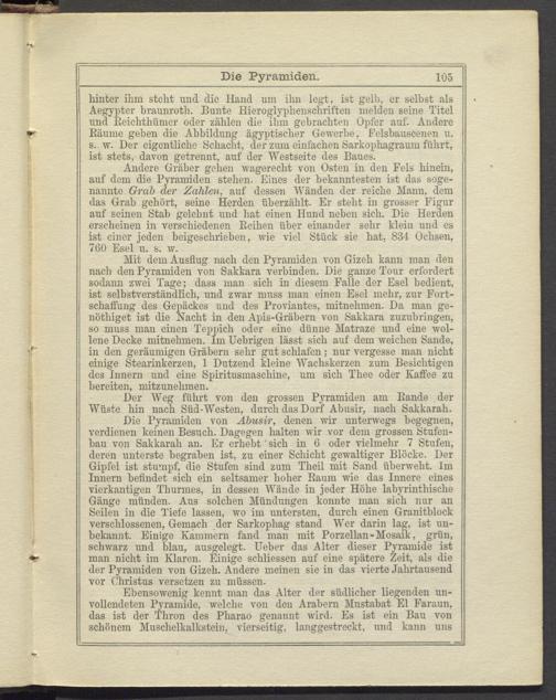 Mit dem Ausflug nach den Pyramiden von Gizeh kann man den nach den Pyramiden von Sakkara verbinden. Die ganze Tour erfordert sodann zwei Tage; dass inan sich in diesem Falle der Esel bedient, ist selbstverständlich, und zwar muss man einen Esel mehr, zur Fort- schaifung des Gepäckes und des Proviantes, mitnehmen. Da man ge- nötliiget ist die Nacht in den Apis-Gräbern von Sakkara zuzubringen, so muss man einen Teppich oder eine dünne Matraze und eine wollene Decke Entnehmen. Im Uebrigen lässt sich auf dem weichen Sande, in den geräumigen Gräbern sehr gut schlafen; nur vergesse man nicht einige Stearinkerzen, 1 Dutzend kleine Wachskerzen zum Besichtigen des Innern und eine Spiritusmascliine, um sich Thee oder Kaffee zu bereiten, mitzunehmen.
