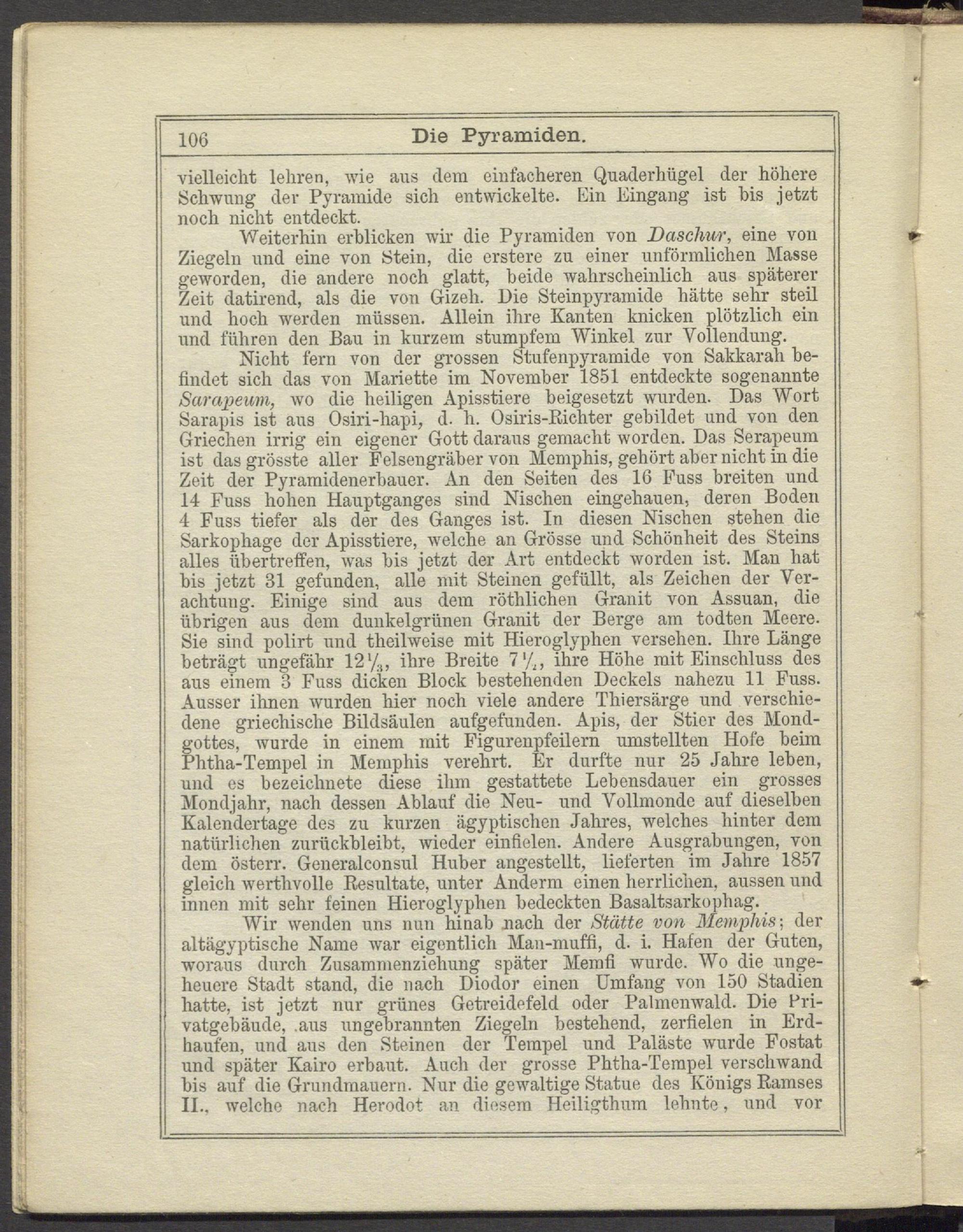 Nicht fern von der grossen Stufenpyramide von Sakkarah befindet sich das von Mariette im November 1851 entdeckte sogenannte Sarapemn, wo die heiligen Apisstiere beigesetzt wurden. Das Wort Sarapis ist aus Osiri-hapi, d. h. Osiris-Richter gebildet und von den Griechen irrig ein eigener Gott daraus gemacht worden. Das Serapeum ist das grösste aller Felsengräber von Memphis, gehört aber nicht in die Zeit der Pyramidenerhauer. An den Seiten des 16 Fuss breiten und 14 Fuss hohen Hauptganges sind Nischen eingehauen, deren Boden 4 Fuss tiefer als der des Ganges ist. In diesen Nischen stehen die Sarkophage der Apisstiere, welche an Grösse und Schönheit des Steins alles übertreffen, was bis jetzt der Art entdeckt worden ist. Man hat bis jetzt 31 gefunden, alle mit Steinen gefüllt, als Zeichen der Verachtung. Einige sind aus dem röthlichen Granit von Assuan, die übrigen aus dem dunkelgrünen Granit der Berge am todten Meere. Sie sind polirt und theilweise mit Hieroglyphen versehen. Ihre Länge beträgt ungefähr 12‘/„ ihre Breite 7'/„ ihre Höhe mit Einschluss des aus einem 3 Fuss dicken Block bestehenden Deckels nahezu 11 Fuss. Ausser ihnen wurden hier noch viele andere Thiersärge und verschiedene griechische Bildsäulen aufgefunden. Apis, der Stier des Mondgottes, wurde in einem mit Figurenpfeilern umstellten Hofe beim Phtha-Tempel in Memphis verehrt. Er durfte nur 25 Jahre leben, und es bezeiclinete diese ihm gestattete Lebensdauer ein grosses Mondjahr, nach dessen Ablauf die Neu- und Vollmonde auf dieselben Kalendertage des zu kurzen ägyptischen Jahres, welches hinter dem natürlichen znriickbleibt, wieder einfielen. Andere Ausgrabungen, von dem österr. Generalconsul Huber angestellt, lieferten im Jahre 1857 gleich werthvolle Resultate, unter Anderm einen herrlichen, aussen und innen mit sehr feinen Hieroglyphen bedeckten Basaltsarkophag.