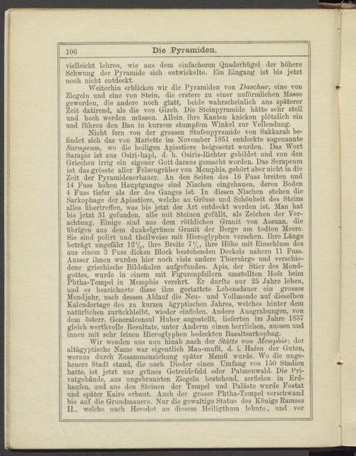 Weiterhin erblicken wir die Pyramiden von Daschur, eine von Ziegeln und eine von Stein, die erstere zu einer unförmlichen Masse geworden, die andere noch glatt, beide wahrscheinlich aus späterer Zeit datirend, als die von Gizeh. Die Steinpyramide hätte sehr steil und hoch werden müssen. Allein ihre Kanten knicken plötzlich ein und führen den Bau in kurzem stumpfem Winkel zur Vollendung.