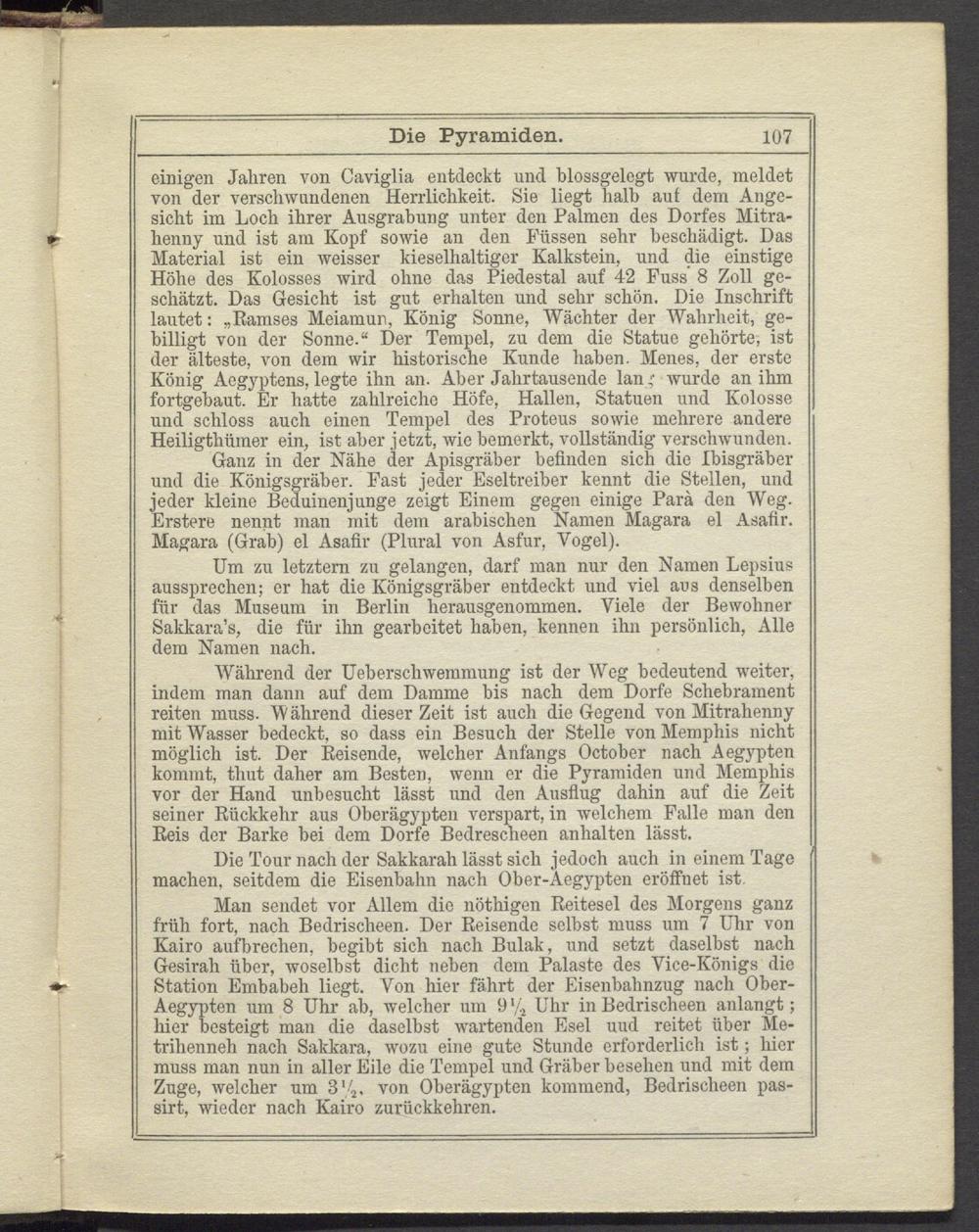 Man sendet vor Allem die nöthigen Reitesel des Morgens ganz früh fort, nach Bedrischeen. Der Reisende selbst muss um 7 Uhr von Kairo aufbrechen, begibt sich nach Bulak, und setzt daselbst nach Gesirah über, woselbst dicht neben dem Palaste des Vice-Königs die Station Embabeli liegt. Von hier fährt der Eisenbahnzug nach Ober- Aegypten um 8 Uhr ah, welcher um 9 % Uhr in Bedrischeen anlangt; hier besteigt man die daselbst wartenden Esel uud reitet über Me- trihenneh nach Sakkara, wozu eine gute Stunde erforderlich ist; hier muss man nun in aller Eile die Tempel und Gräber besehen und mit dem Zuge, welcher um 3'4. von Oherägypten kommend, Bedrischeen pas- sirt, wieder nach Kairo zurückkehren.
