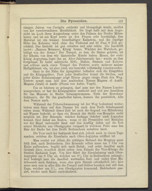 Während der Ueherschwemmung ist der Weg bedeutend weiter, indem man dann auf dem Damme bis nach dem Dorfe Schebrament reiten muss. Während dieser Zeit ist auch die Gegend von Mitrahenny mit Wasser bedeckt, so dass ein Besuch der Stelle von Memphis nicht möglich ist. Der Reisende, welcher Anfangs October nach Aegypten kommt, thut daher am Besten, wenn er die Pyramiden und Memphis vor der Hand unbesucht lässt und den Ausflug dahin auf die Zeit seiner Rückkehr aus Oberägypten verspart, in welchem Falle man den Reis der Barke bei dem Dorfe Bedrescheen anhalten lässt.