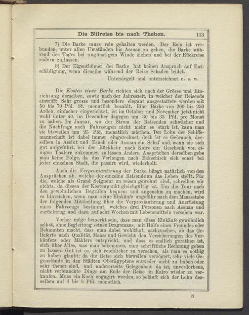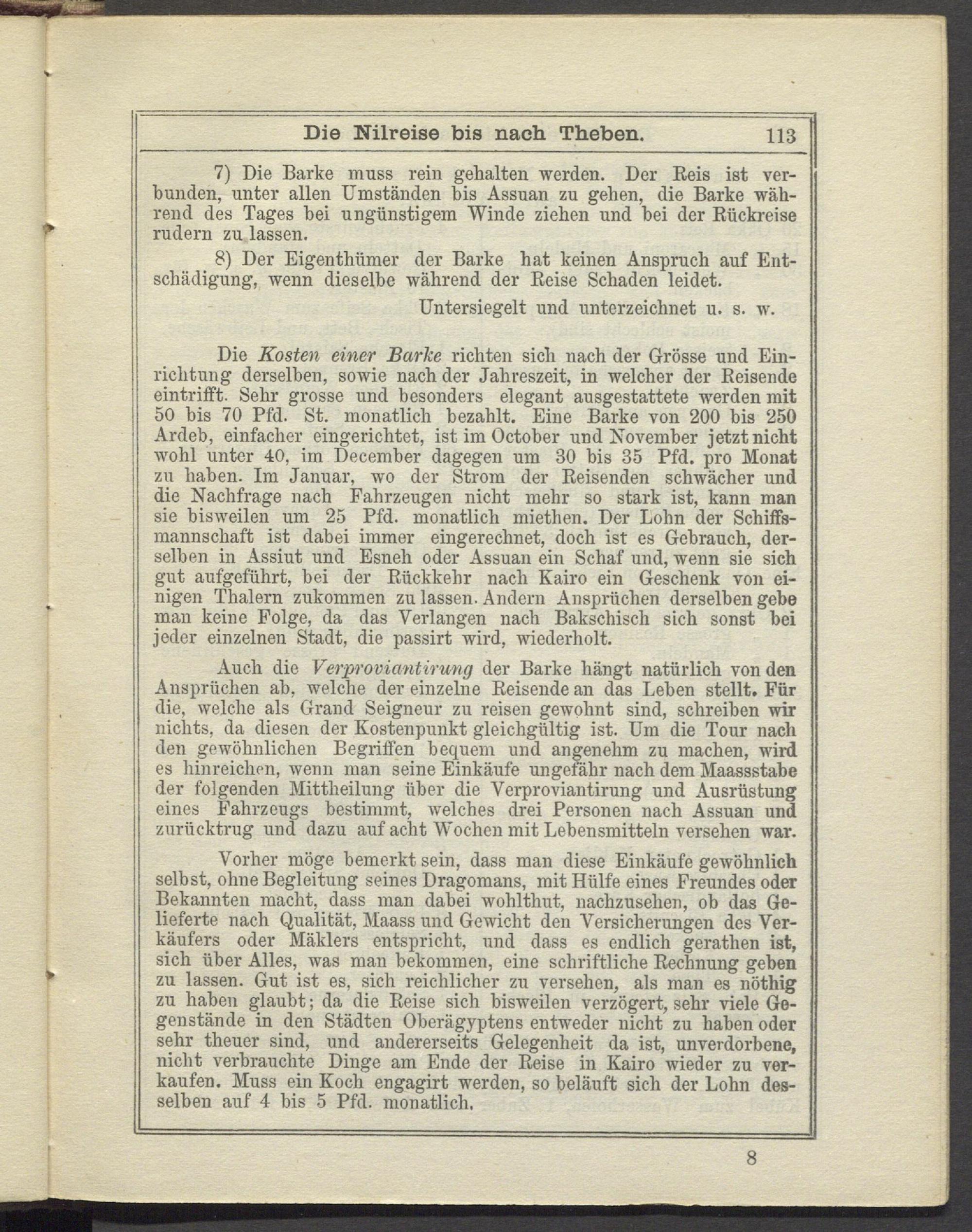 7) Die Barke muss rein gehalten werden. Der Reis ist verbunden, unter allen Umständen bis Assuan zu gehen, die Barke während des Tages hei ungünstigem Winde ziehen und hei der Rückreise rudern zu lassen.