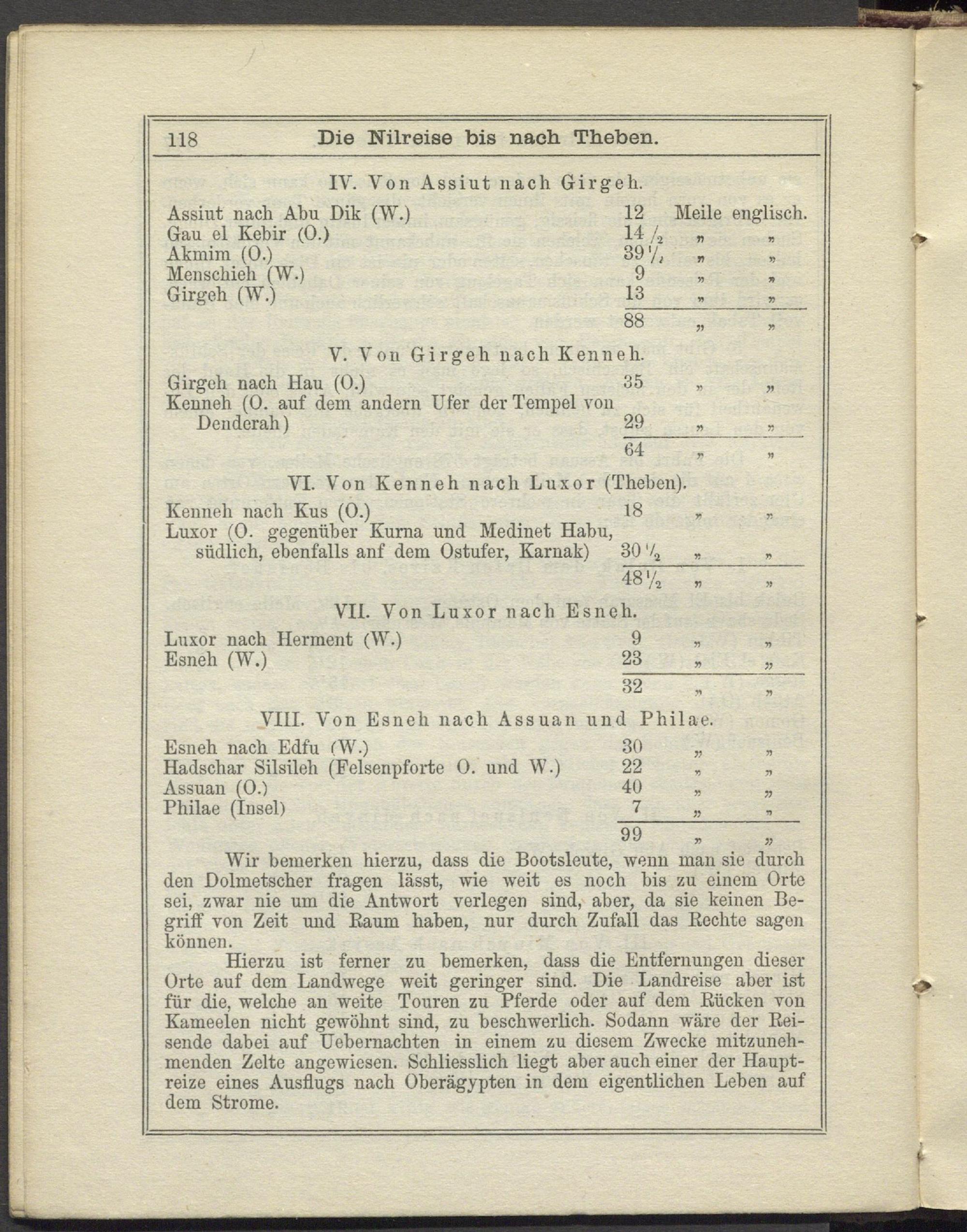 Hierzu ist ferner zu bemerken, dass die Entfernungen dieser Orte auf dem Landwege weit geringer sind. Die Landreise aber ist für die, welche an weite Touren zu Pferde oder auf dem Bücken von Kameelen nicht gewöhnt sind, zu beschwerlich. Sodann wäre der Beisende dabei auf Uebernachten in einem zu diesem Zwecke mitzunehmenden Zelte angewiesen. Schliesslich liegt aber auch einer der Hauptreize eines Ausflugs nach Oberägypten in dem eigentlichen Leben auf dem Strome.