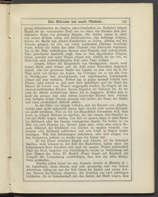| welche man nicht unbesucht lassen darf, obwohl viele neuere Reisende i sie nicht erwähnen. Wer sie bei der Hinauffahrt betrachten will, thut I wohl, zu Girgeh Reitesel zu miethen, die ihn binnen drei Stunden an ' Ort und Stelle tragen werden. Um Zeit su sparen, kann er seine Barke bis Bellianeh oder bis Samata vorausgehen lassen, bis wohin es ein Ritt von zwei Stunden ist. Ebenso kann man, wenn man seinen Besuch während der Rückfahrt von Theben zu machen wünscht, von Samata oder Bellianeh aufbrechen und sein Schiff in Girgeh wieder besteigen. Will man Zeichnungen aufnehmen oder sich einiges von den Sculpturen notiren, so breche man bei Zeiten auf.