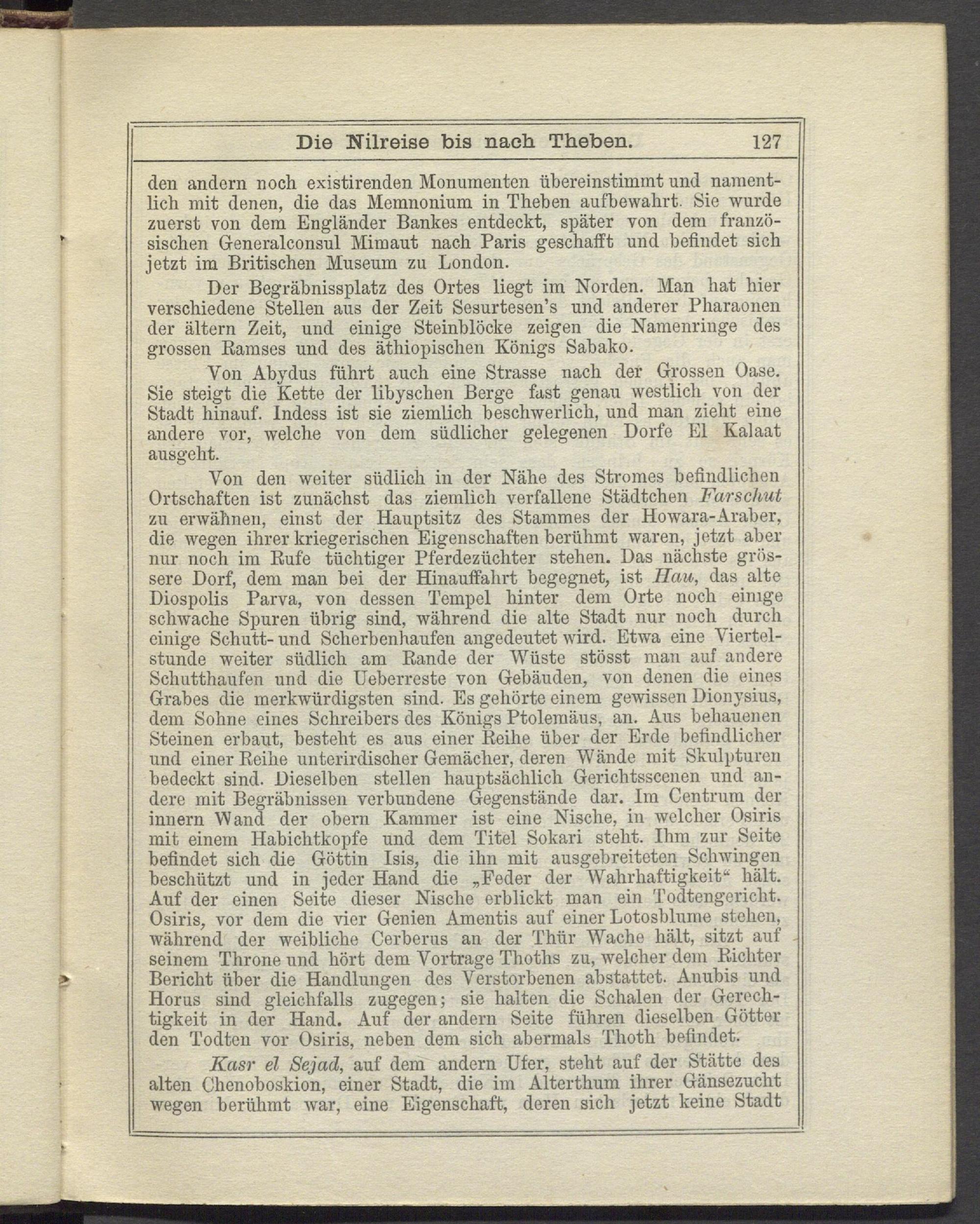 Von den weiter südlich in der Nähe des Stromes befindlichen Ortschaften ist zunächst das ziemlich verfallene Städtchen Farschut zu erwähnen, einst der Hauptsitz des Stammes der Howara-Araber, die wegen ihrer kriegerischen Eigenschaften berühmt waren, jetzt aber nur noch im Rufe tüchtiger Pferdezüchter stehen. Das nächste grössere Dorf, dem man bei der Hinauffahrt begegnet, ist Hau , das alte Diospolis Parva, von dessen Tempel hinter dem Orte noch einige schwache Spuren übrig sind, während die alte Stadt nur noch durch einige Schutt- und Scherbenhaufen angedeutet wird. Etwa eine Viertelstunde weiter südlich am Rande der Wüste stösst man auf andere Schutthaufen und die Ueberreste von Gebäuden, von denen die eines Grabes die merkwürdigsten sind. Es gehörte einem gewissen Dionysius, dem Sohne eines Schreibers des Königs Ptolemäus, an. Aus behauenen Steinen erbaut, besteht es aus einer Reihe über der Erde befindlicher und einer Reihe unterirdischer Gemächer, deren Wände mit Skulpturen bedeckt sind. Dieselben stellen hauptsächlich Gerichtsscenen und andere mit Begräbnissen verbundene Gegenstände dar. Im Centrum der innern Wand der obern Kammer ist eine Nische, in welcher Osiris mit einem Habichtkopfe und dem Titel Sokari steht. Ihm zur Seite befindet sich die Göttin Isi3, die ihn mit ausgebreiteton Schwingen beschützt und in jeder Hand die „Feder der Wahrhaftigkeit“ hält. Auf der einen Seite dieser Nische erblickt man ein Todtengericlit. Osiris, vor dem die vier Genien Amentis auf einer Lotosblume stehen, während der weibliche Cerberus an der Thür Wache hält, sitzt auf seinem Throne und hört dem Vortrage Thoths zu, welcher dem Richter Bericht über die Handlungen des Verstorbenen abstattet. Anubis und Horus sind gleichfalls zugegen; sie halten die Schalen der Gerechtigkeit in der Hand. Auf der andern Seite führen dieselben Götter den Todten vor Osiris, neben dem sich abermals Thoth befindet.