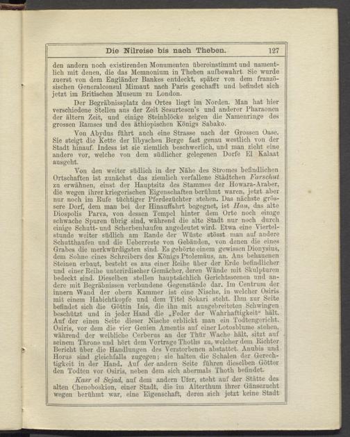 Von Abydus führt auch eine Strasse nach der Grossen Oase. Sie steigt die Kette der libyschen Berge fast genau westlich von der Stadt hinauf. Indess ist sie ziemlich beschwerlich, und man zieht eine andere vor, welche von dem südlicher gelegenen Dorfe El Kalaat ausgeht.