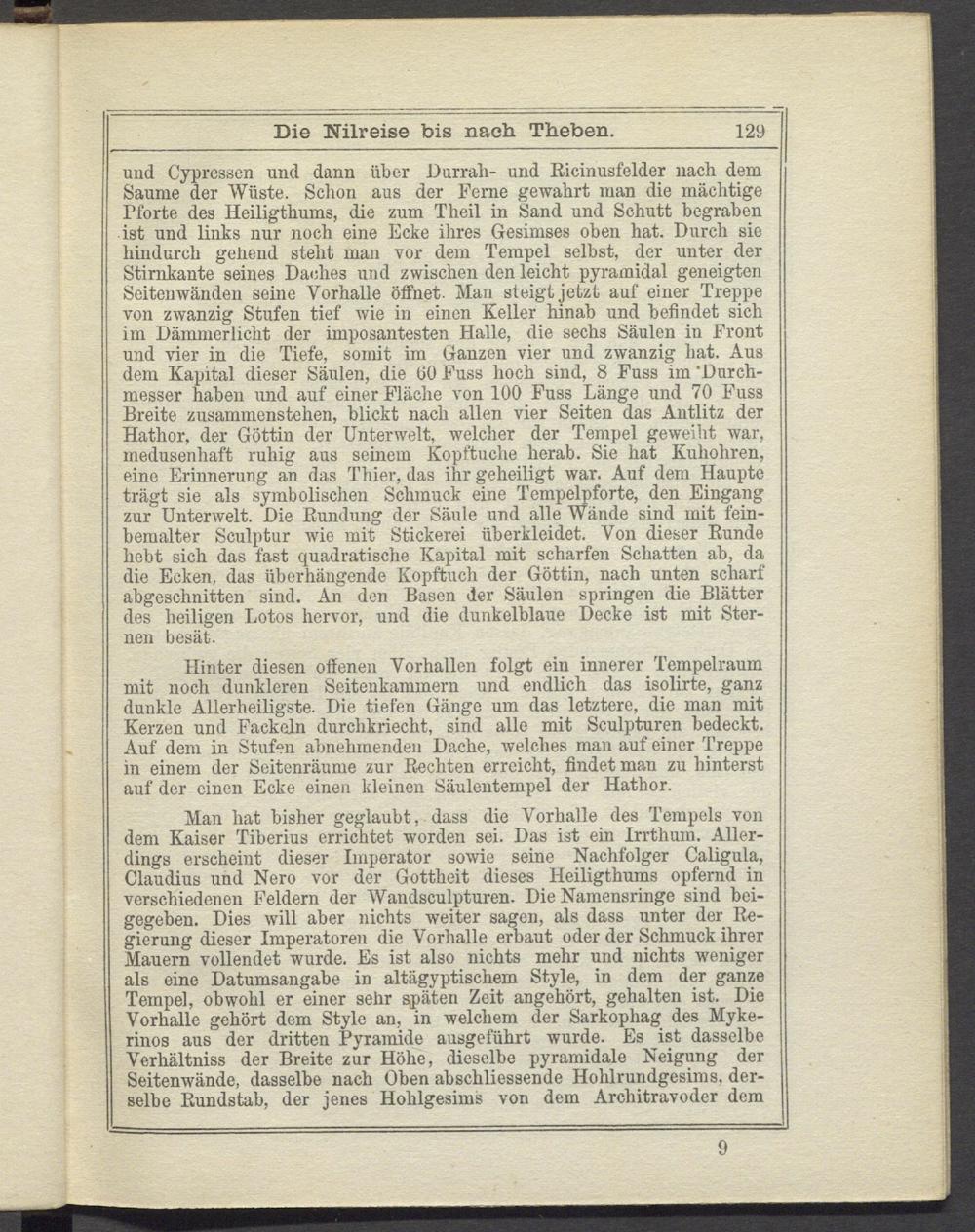 und Cypressen und dann über Durrah- und Ricinusfelder nach dem Saume der Wüste. Schon aus der Ferne gewahrt man die mächtige Pforte des Heiligthums, die zum Theil in Sand und Schutt begraben ist und links nur noch eine Ecke ihres Gesimses oben hat. Durch sie hindurch gehend steht man vor dem Tempel selbst, der unter der Stimkante seines Daches und zwischen den leicht pyramidal geneigten Seitenwänden seine Vorhalle öffnet. Man steigt jetzt auf einer Treppe von zwanzig Stufen tief wie in einen Keller hinab und befindet sich im Dämmerlicht der imposantesten Halle, die sechs Säulen in Front und vier in die Tiefe, somit im Ganzen vier und zwanzig hat. Aus dem Kapital dieser Säulen, die 00 Fuss hoch sind, 8 Fuss im 'Durchmesser haben und auf einer Fläche von 100 Fuss Länge und 70 Fuss Breite zusammenstehen, blickt nach allen vier Seiten das Antlitz der Hathor. der Göttin der Unterwelt, welcher der Tempel geweiht war, inedusenhaft ruhig aus seinem Kopftuche herab. Sie hat Kuhohren, eine Erinnerung an das Thier, das ihr geheiligt war. Auf dem Haupte trägt sie als symbolischen Schmuck eine Tempelpforte, den Eingang zur Unterwelt. Die Rundung der Säule und alle Wände sind mit feinbemalter Sculptur wie mit Stickerei überkleidet. Von dieser Runde hebt sich das fast quadratische Kapital mit scharfen Schatten ab, da die Ecken, das überhängende Kopftuch der Göttin, nach unten scharf abgeschnitten sind. An den Basen der Säulen springen die Blätter des heiligen Lotos hervor, und die dunkelblaue Decke ist mit Sternen besät.