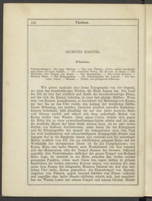 Vorbemerkungen: Die Lage Thebens. — Das alte Theben, Abriss seiner Geschichte und seiner einstigen Gestalt. — Die schnellste Weise, die Ruinen zu sehen. — Die Westseite: Der Tempel von Kurna. — Das Jlemnonium. — Die beiden Kolosse. — Medinet Habu. — Die Königsgräber. — Die Priestergräber des Assasif. — Die Ostseite: Luxor. — Karnak. - Punkte von geringerem Interesse.