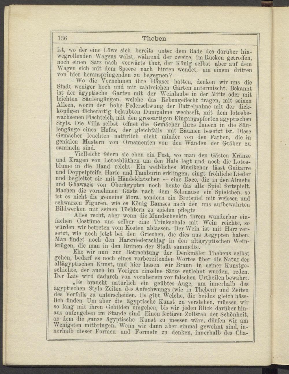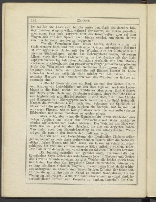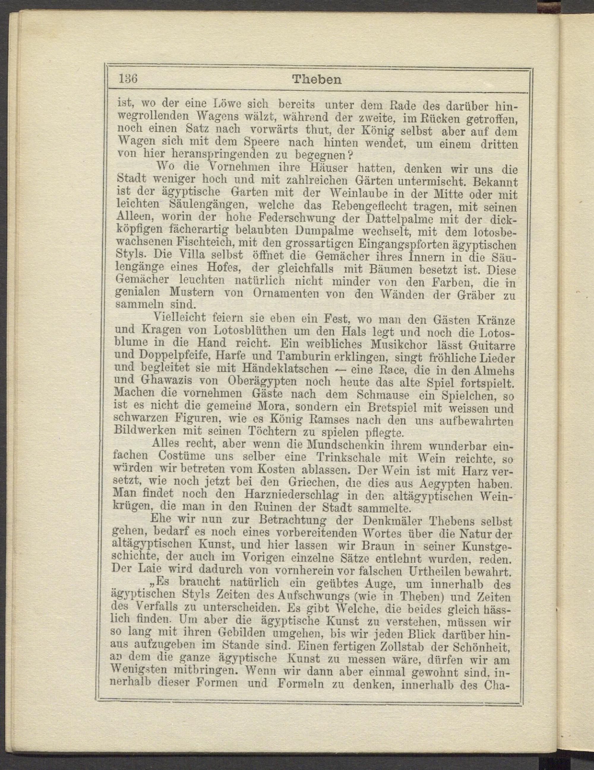 Ehe wir nun zur Betrachtung der Denkmäler Thebens selbst gehen, bedarf es noch eines vorbereitenden Wortes über die Natur der altägyptischen Kunst, und hier lassen wir Braun in seiner Kunstgeschichte, der auch im Vorigen einzelne Sätze entlehnt wurden, reden. Der Laie wird dadurch von vornherein vor falschen Urtlieilen bewahrt.