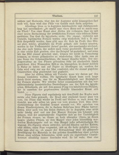 Allerdings hiess os in Aegypten Jahrhunderte und Jahrtausende lang fast unverändert: „So macht man einen Mann und so macht man ein Pferd.“ Von einer Kunst aber dürfen wir verlangen, dass sie mit einer neuen Beobachtung der erwähltesten Formen einer schönen Natur nachfalire. Das thut die ägyptische nicht. Die einmal, vielleicht mit Unrecht, legitimirten Formen werden ewig wiederholt. Soll z. B. eine Kuh dargestellt werden, dann gibt man die Kuh im Profil, ihre Hörner aber, welche, gleichfalls im Profil gefasst, sich decken müssten, werden in der Vorderansicht darauf gesetzt, also auseinander strebend, das eine nach hinten, das andere nach vorne geschweift. Niemand hat je eine solche Kuh gesehen, aber das Beispiel ist ansteckend, und wenn wir das Bild einmal gewohnt sind, können wir leicht in Versuchung kommen, es ebenso gedankenlos zu wiederholen. Oder denke man an jene Scene des Ochsenschlachtens, die immer dieselbe bleibt. Der niedergeworfene an den Füssen gebundene Ochs ist abscheulich falsch gezeichnet. Aber Niemandem fallt es ein, hinzugehen, wo dieser Anblick in Natur zu haben und auf Papier zu übertragen ist, sondern der Ochs wird ewig nur aus der Idee construirt, oder die einmal gegebene Construction ewig geschwatzt und geglaubt.