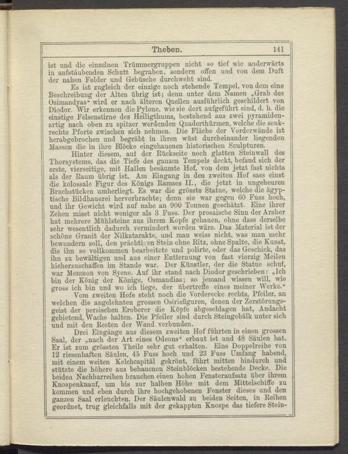 Hinter diesem, auf der Bückseite noch glatten Steinwall des Thorsystems, das die Tiefe des ganzen Tempels deckt, befand sich der erste, vierseitige, mit Hallen besäumte Hof, von dem jetzt fast nichts als der Baum übrig ist. Am Eingang in den zweiten Hof sass einst die kolossale Figur des Königs Bamses II., die jetzt in ungeheuren Bruchstücken umherliegt. Es war die grösste Statue, welche die ägyptische Bildhauerei hervorbrachte; denn sie war gegen 60 Fuss hoch, und ihr Gewicht wird auf nahe an 900 Tonnen geschätzt. Eine ihrer Zehen misst nicht weniger als 3 Fuss. Der prosaische Sinn der Araber hat mehrere Mühlsteine aus ihrem Kopfe gehauen, ohne dass derselbe sehr wesentlich dadurch vermindert worden wäre. Das Material ist der schöne Granit der Nilkatarakte, und man weiss nicht, was man mehr bewundern soll, den prächtigen Stein ohne Bitz, ohne Spalte, die Kunst, die ihn so vollkommen bearbeitete und polirte, oder das Geschick, das ihn zu bewältigen und aus einer Entfernung von fast vierzig Meilen hieherzuschaffen im Stande war. Der Künstler, der die Statue schuf, war Mernnon von Syene. Auf ihr stand nach Diodor geschrieben: „Ich bin der König der Könige, Osmandias; so jemand wissen will, wie gross ich bin und wo ich liege, der übertreffe eines meiner Werke.“
