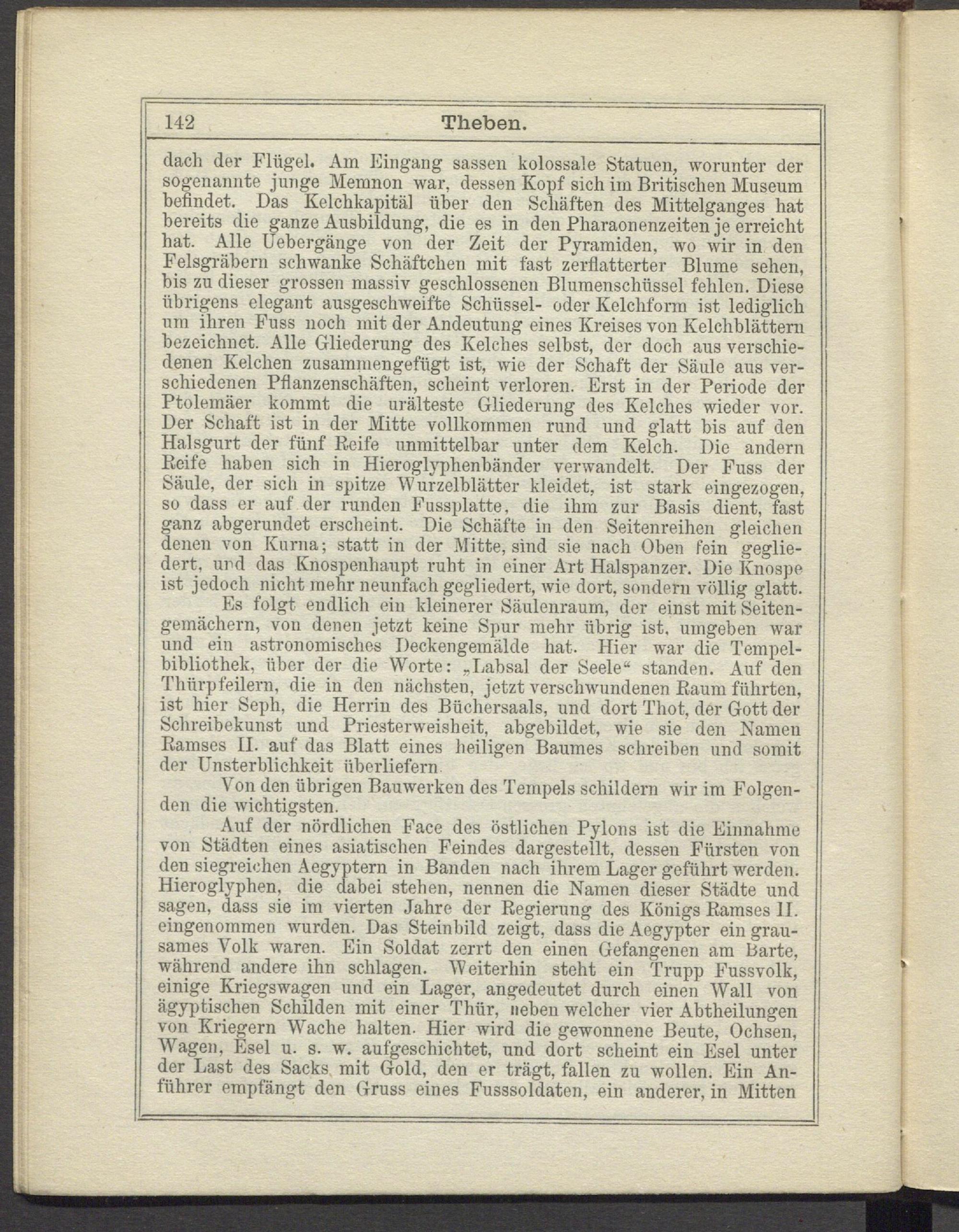dach der Flügel. Am Eingang sassen kolossale Statuen, worunter der sogenannte junge Memnon war, dessen Kopf sich im Britischen Museum befindet. Das Kelchkapitäl über den Schäften des Mittelganges hat bereits die ganze Ausbildung, die es in den Pharaonenzeiten je erreicht hat. Alle Uebergänge von der Zeit der Pyramiden, wo wir in den Felsgräbern schwanke Schäftclien mit fast zerflatterter Blume sehen, bis zu dieser grossen massiv geschlossenen Blumenschüssel fehlen. Diese übrigens elegant ausgeschweifte Schüssel- oder Kelchfonn ist lediglich nm ihren Fuss noch mit der Andeutung eines Kreises von Kelchblättern bezeichnet. Alle Gliederung des Kelches selbst, der doch aus verschiedenen Kelchen zusammengefügt ist, wie der Schaft der Säule aus verschiedenen Pflanzenschäften, scheint verloren. Erst in der Periode der Ptolemäer kommt die urälteste Gliederung des Kelches wieder vor. Der Schaft ist in der Mitte vollkommen rund und glatt bis auf den Halsgurt der fünf Reife unmittelbar unter dem Kelch. Die andern Reife haben sich in Hieroglyphenbänder verwandelt. Der Fuss der Säule, der sich in spitze Wurzelblätter kleidet, ist stark eingezogen, so dass er auf der runden Fussplatte, die ihm zur Basis dient, fast ganz abgerundet erscheint. Die Schäfte in den Seitenreihen gleichen denen von Kurna; statt in der Mitte, sind sie nach Oben fein gegliedert. und das Knospenhaupt ruht in einer Art Halspanzer. Die Knospe ist jedoch nicht mehr neunfach gegliedert, wie dort, sondern völlig glatt.