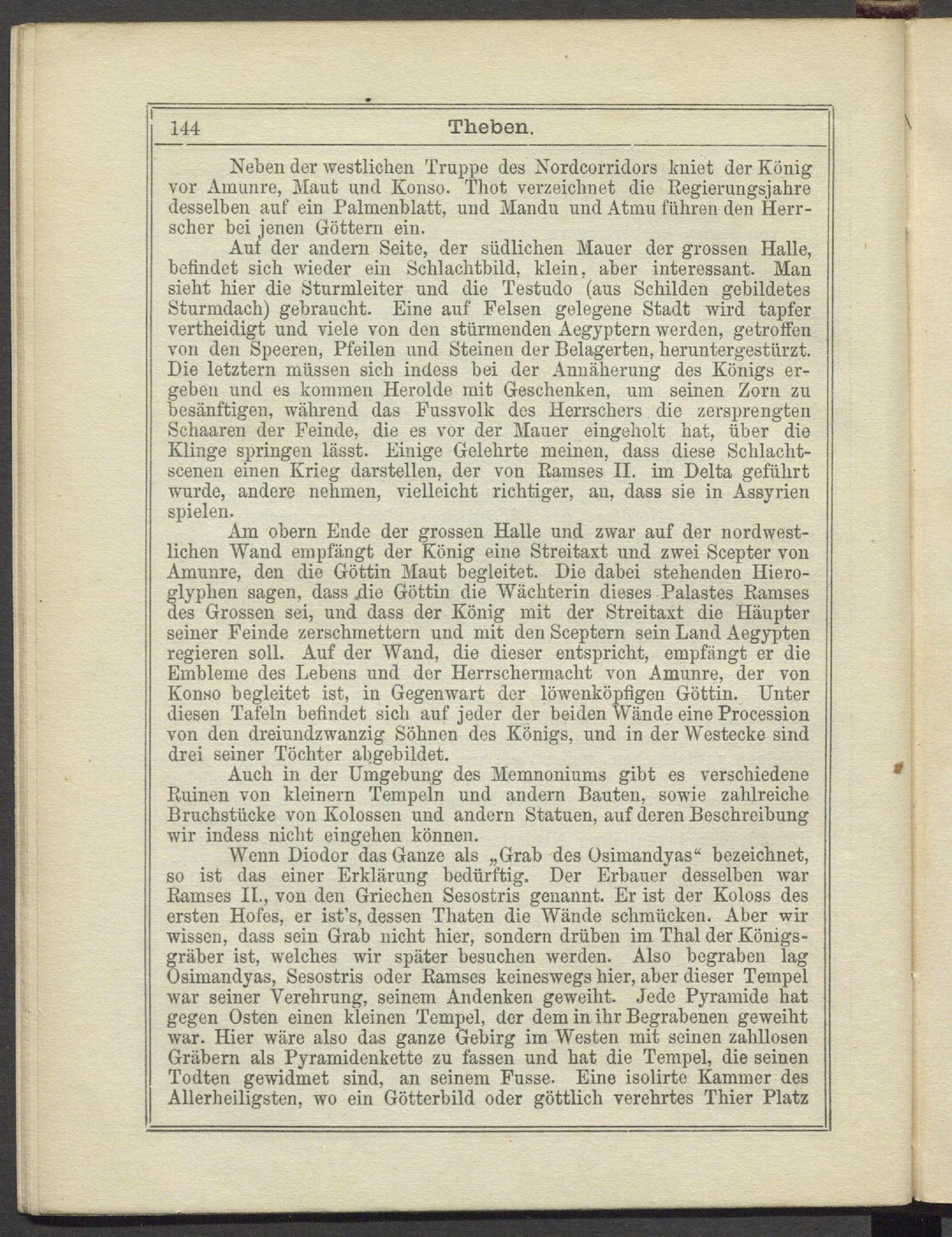 Wenn Diodor das Ganze als „Grab des Osimandyas“ bezeichnet, so ist das einer Erklärung bedürftig. Der Erbauer desselben war Ramses II., von den Griechen Sesostris genannt. Er ist der Koloss des ersten Hofes, er ist’s, dessen Thaten die Wände schmücken. Aber wir wissen, dass sein Grab nicht hier, sondern drüben im Thal der Königsgräber ist, welches wir später besuchen werden. Also begraben lag Osimandyas, Sesostris oder Ramses keineswegs hier, aber dieser Tempel war seiner Verehrung, seinem Andenken geweiht. Jede Pyramide hat gegen Osten einen kleinen Tempel, der dem in ihr Begrabenen geweiht war. Hier wäre also das ganze Gebirg im Westen mit seinen zahllosen Gräbern als Pyramidenkette zu fassen und hat die Tempel, die seinen Todten gewidmet sind, an seinem Fusse. Eine isolirte Kammer des Allerheiligsten, wo ein Götterbild oder göttlich verehrtes Thier Platz