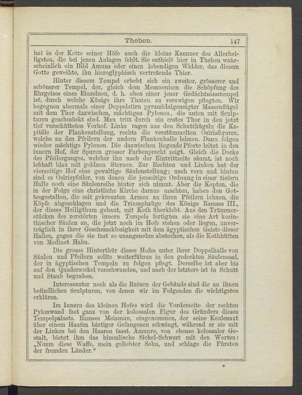 Hinter diesem Tempel erhebt sich ein zweiter, grösserer und schönerer Tempel, der, gleich dem Memnonium die Schöpfung des Ehrgeizes eines Einzelnen, d. h. eben einer jener Gedächtnissstempel ist, durch welche Könige ihre Thaten zu verewigen pflegten. Wir begegnen abermals einer Doppelstirn pyramidalgeneigter Massenflügel mit dem Thor dazwischen, mächtigen Pylonen, die unten mit Sculp- turen geschmückt sind. Man tritt durch ein erstes Thor in den jetzt tief verschütteten Vorhof. Links ragen aus den Schutthügeln die Kapitale der Flankenstellung, rechts die verstümmelten Osirisfiguren, welche an den Pfeilern der andern Flankenhalle lehnen. Dann folgen wieder mächtige Pylonen. Die dazwischen liegende Pforte leitet in den innern Hof, der Spuren grosser Farbenpracht zeigt. Gleich die Decke iles Pfeilerganges, welcher ihn nach der Eintrittseite säumt, ist noch lebhaft blau mit goldnen Sternen. Zur Rechten und Linken hat der vierseitige Hof eine gewaltige Säulenstellung; nach vorn und hinten sind es Osirispfeiler, von denen die jenseitige Ordnung in einer tiefem Halle noch eine Säulenreihe hinter sich nimmt, xlber die Kopten, die in der Folge eine christliche Kirche daraus machten, haben den Gottesgestalten, die mit gekreuzten Armen an ihren Pfeilern lehnen, die Köpfe abgeschlagen und die Triumphzüge des Königs Ramses III., der dieses Heiligthum gebaut, mit Koth überklebt. Aus den Trümmerstücken des zerstörten innern Tempels fertigten sie eine Art korinthischer Säulen an, die jetzt noch im Hofe stehen oder liegen, unverträglich in ihrer Geschmacklosigkeit mit dem ägyptischen Geiste dieser Hallen, gegen die sie fast so unangenehm abstechen, als die Kothhütten von Medinet Habu.